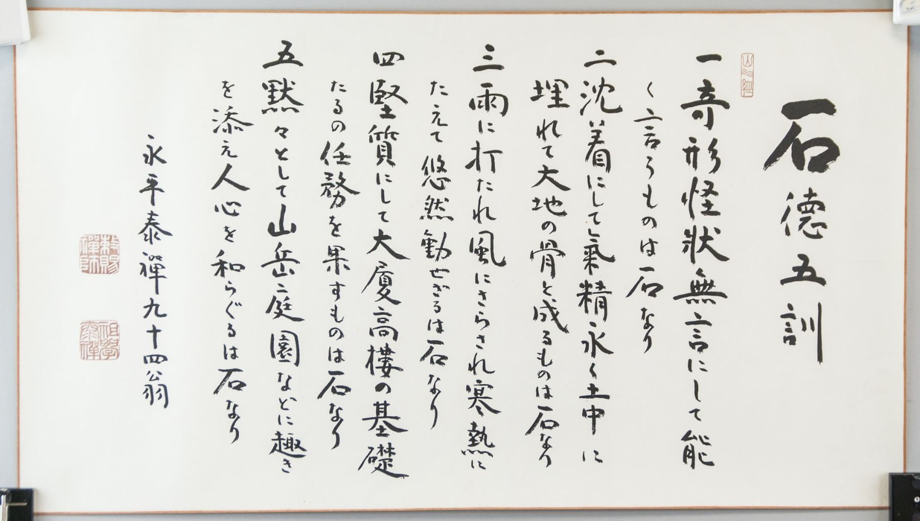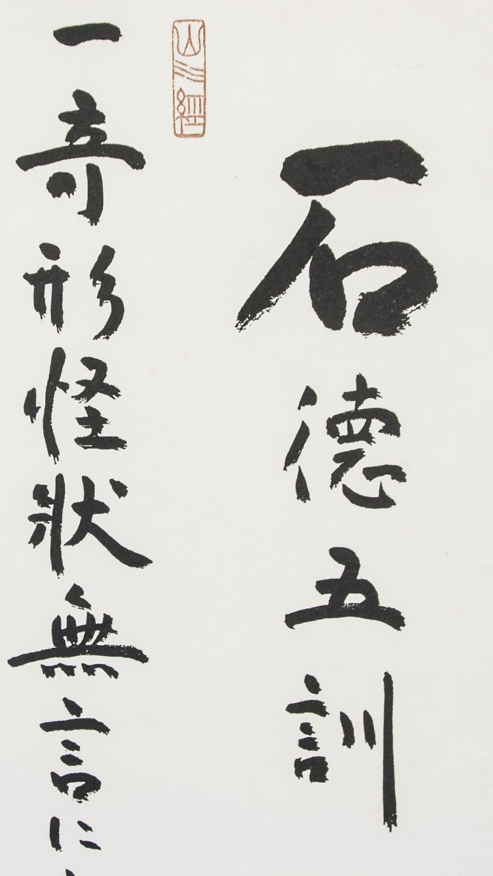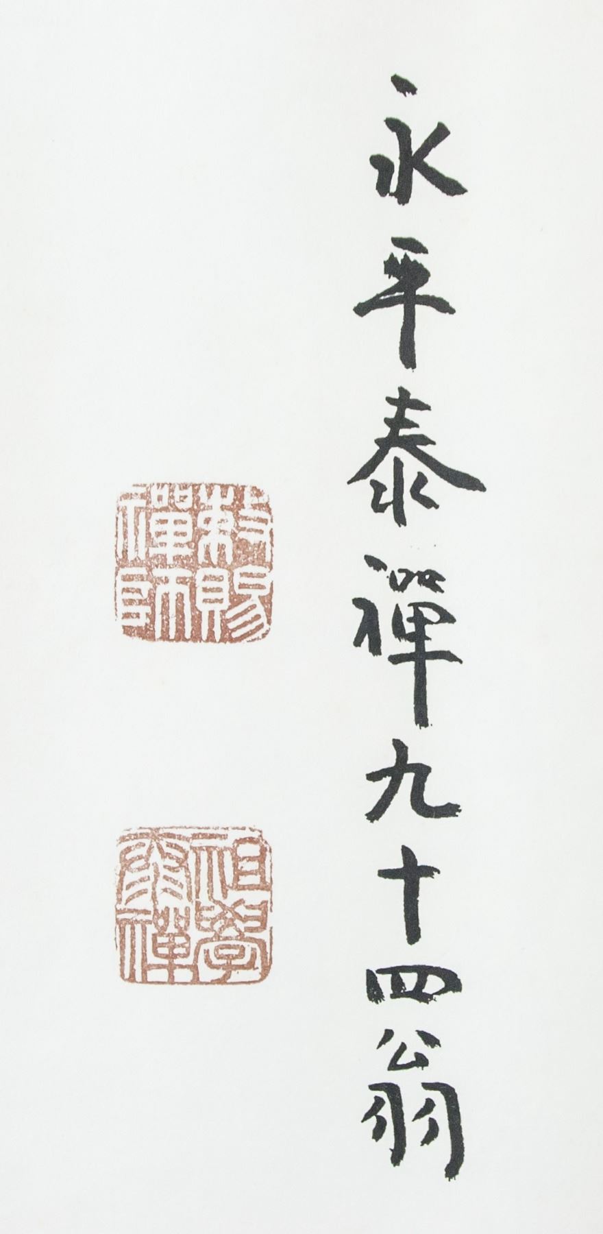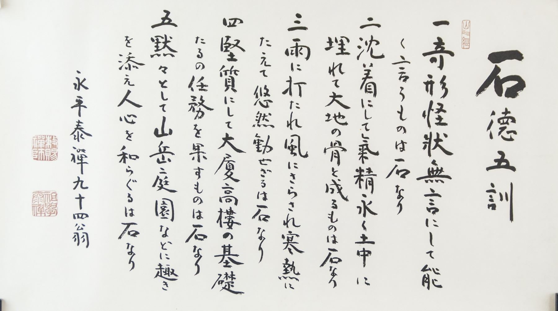 Japanese printed ink on paper. Featuring calligraphy of the five lectures of the stone. Original by temple master. Inscribed with three seals. 62 x 35 cm. Provenance: Private collection, Philippines