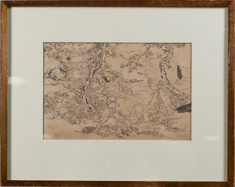 Depicting a scene with artist painting a procession of figures carrying another figure through a wooded landscape in celebration. Figures have happy expressions on their faces. Condition shows toning stain on lower left and ink stains to right edge. Image is not signed yet an noted in pencil lower left in block letters "Hokusai" matted and framed in 1940's simple wood frame and sealed in back.
