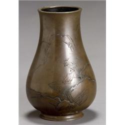 Japanese Inlaid Bronze Vase, Signed Yoshimasa, Meiji Period (1868-1912), Cast in shallow reli...