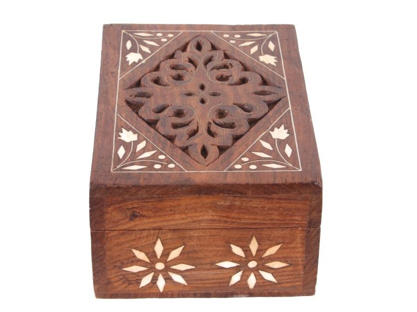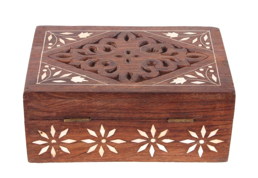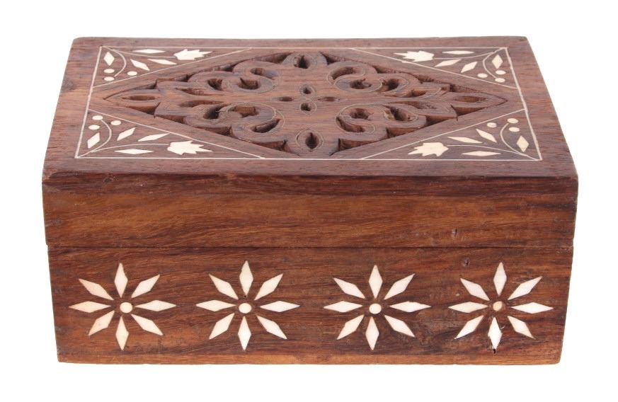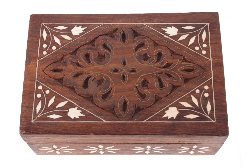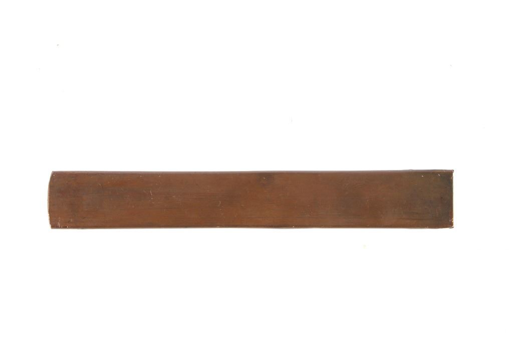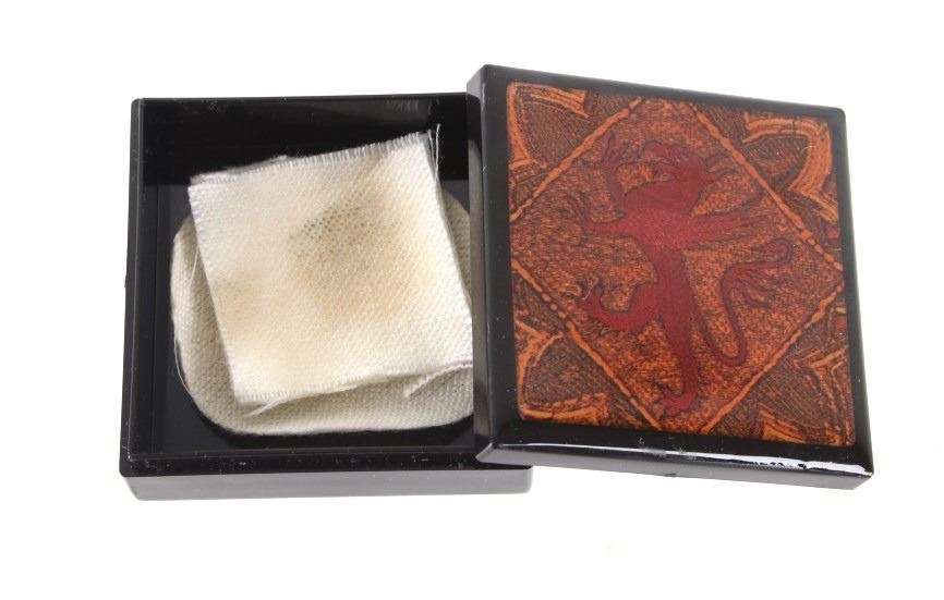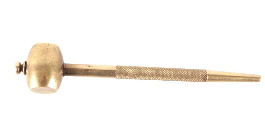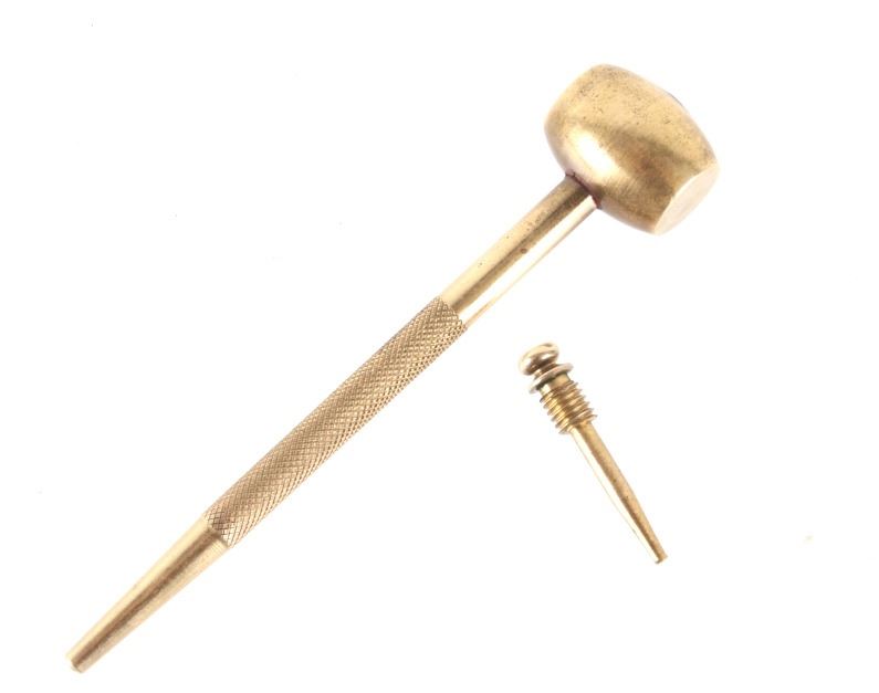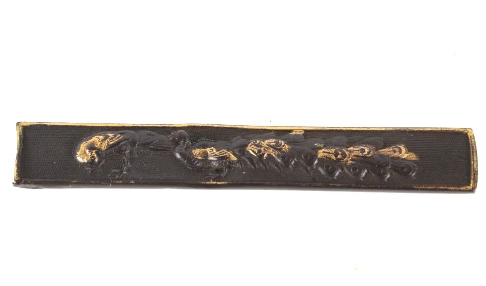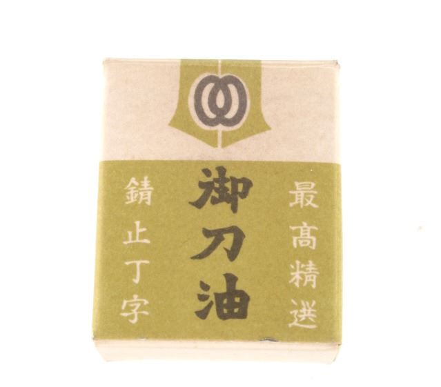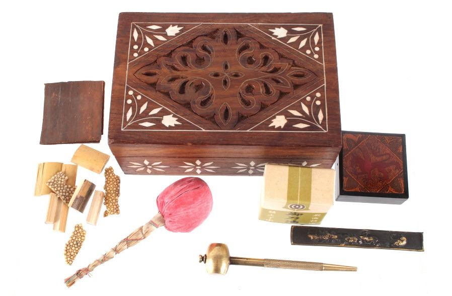 Featured in this lot we have an inlayed box containing Japanese katana blade cleaning and maintenance tools. The cleaning tools consist of a brass mekugi hammer, uchiko ball with powder, choji sword oil, cloth patches for oil, kozuka handle, and additional copper and wood material. The hammer shows brass construction with knurling across the middle and a removeable awl the is treaded into the top of the hammer head. The uchiko ball is filled with uchiko powder which is made from ground up polishing stones and is used to maintain the surface of the blade.  The choji sword oil with its original box and a glass bottle with some of the oil remaining. The cloth patches are used for spreading the oil and come in a plastic box with a griffon design on the front. Finally the kit comes with a brass kozuka handle showing a depiction of two peacocks along with copper and bamboo parts used for fixing or replacing guard spacers and mekugi pins. The parts come in a carved wood box with inlayed brass and ivory across the top and sides. The piece shows good condition overall with some light wear due to use. The kit weighs 1lb 4oz.