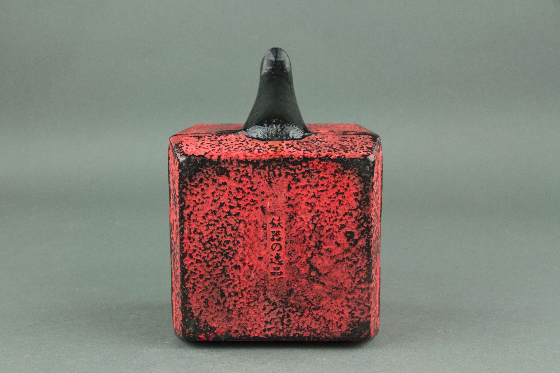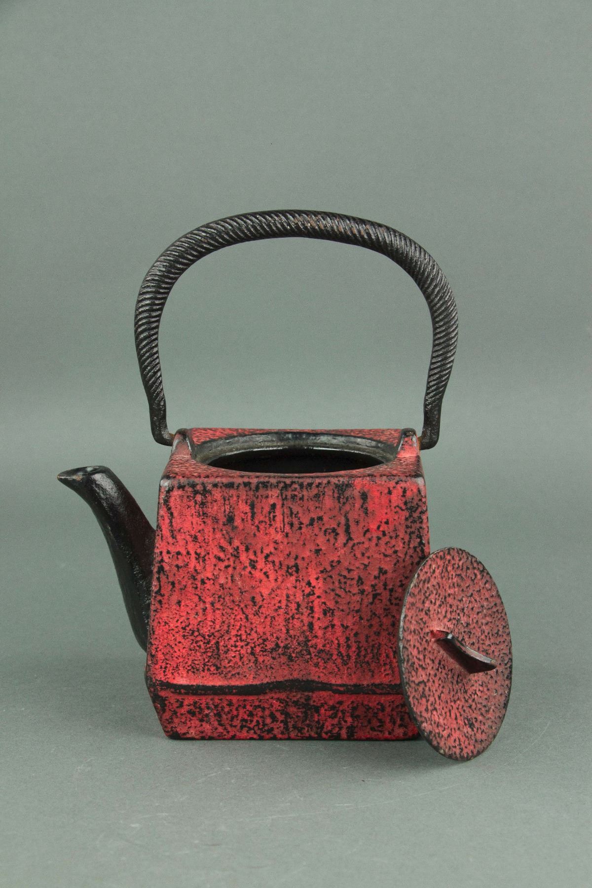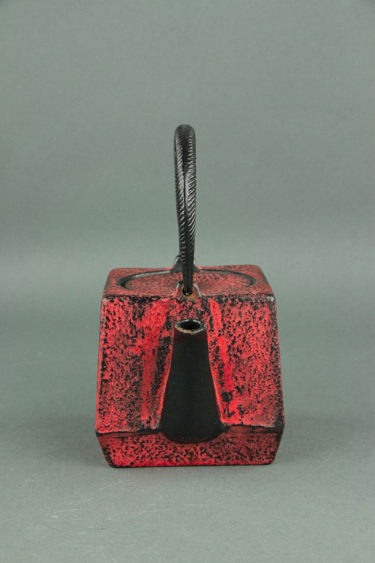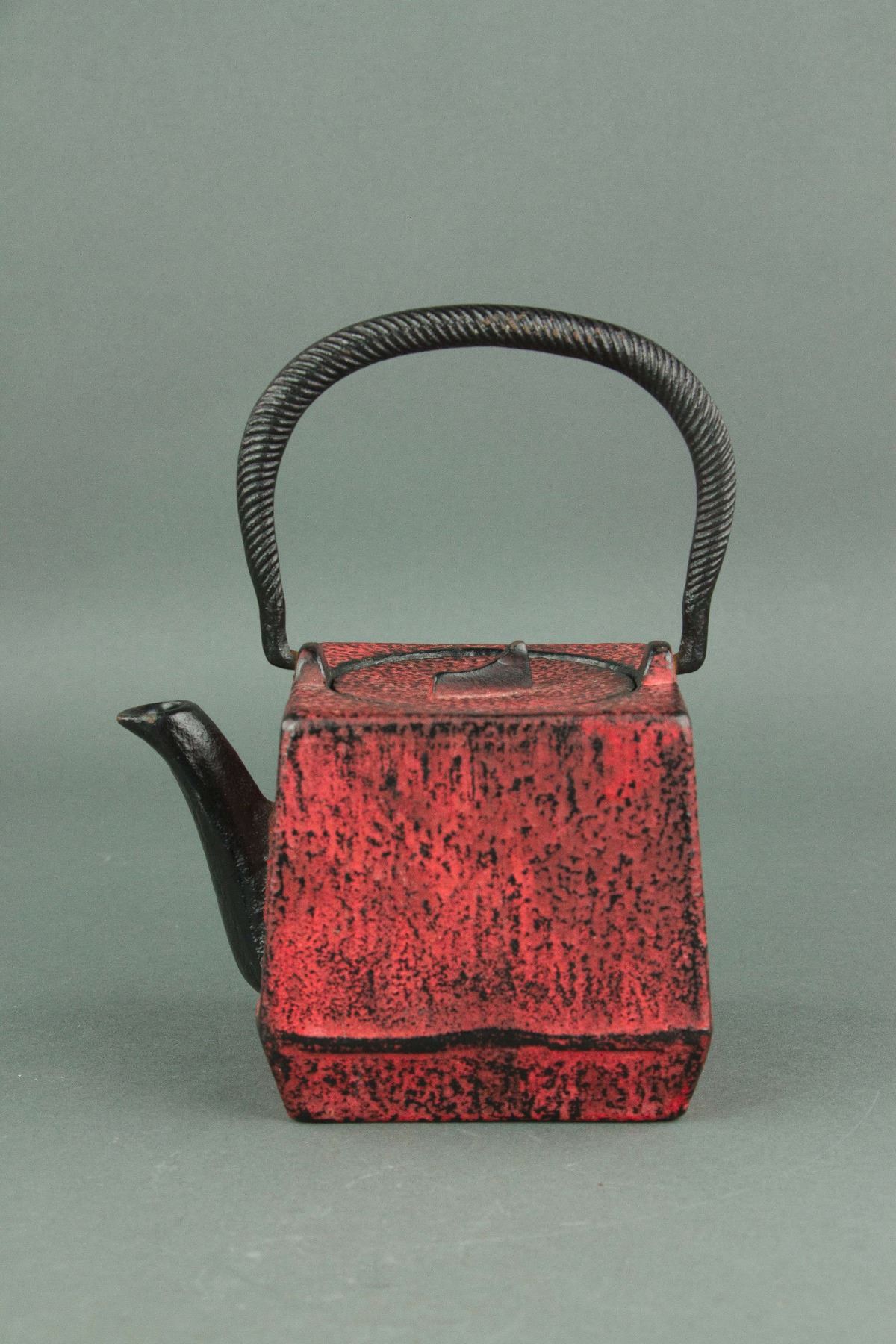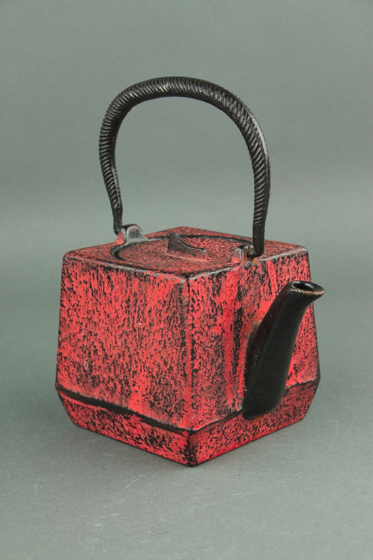 Japanese cast iron teapot; Nambu Tekki ironware; of square shape with handle; of coral red colour; six-character mark on base; H: 19 with Handle ,11 cm without Handle, D: 14 cm, 1701 grams
