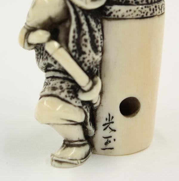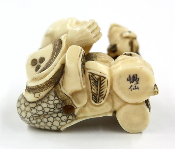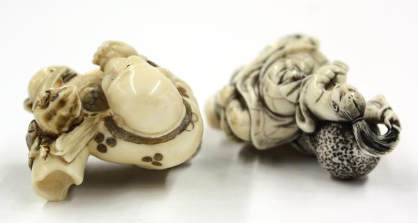 (Lot of 2) Japanese ivory figural netsuke, Taisho/early Showa period, the first portraying Benkei and Yoshitsune fighting at Gojo Bridge, signed Kogyoku, with incised details picked out in dark stain, 2.25''h; the second of a seated sage holding an offering for a small toad resting on a large bamboo stalk, signed [Ryu]sen, with brown and black pigment accents, 1.325''l