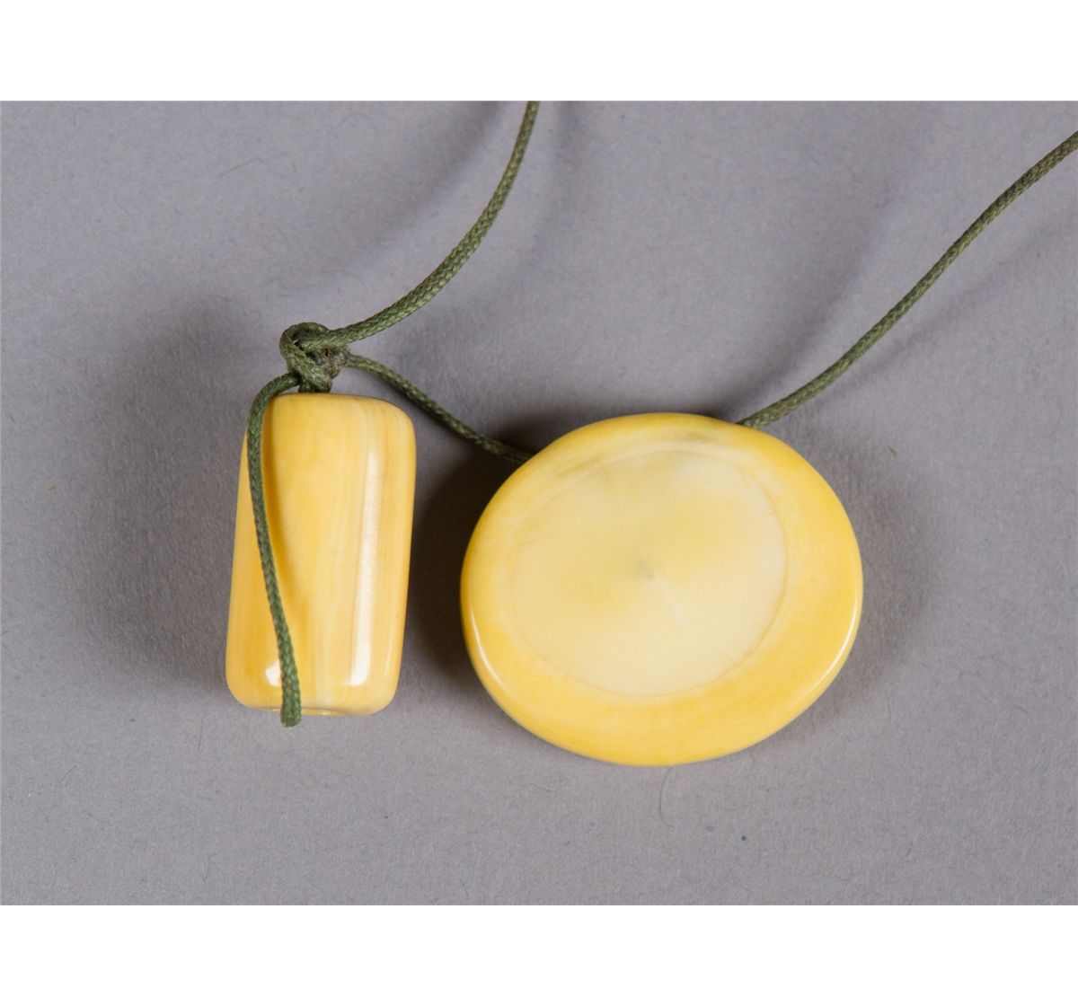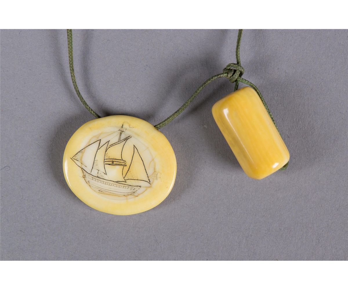 Two pieces of Japanese ivory ojime pendants; of circular and cylindrical form; featuring carvings of sailing ship; L: 2 cm, W: 2 cm, 5 grams