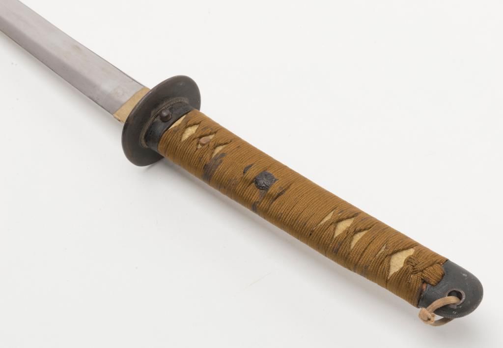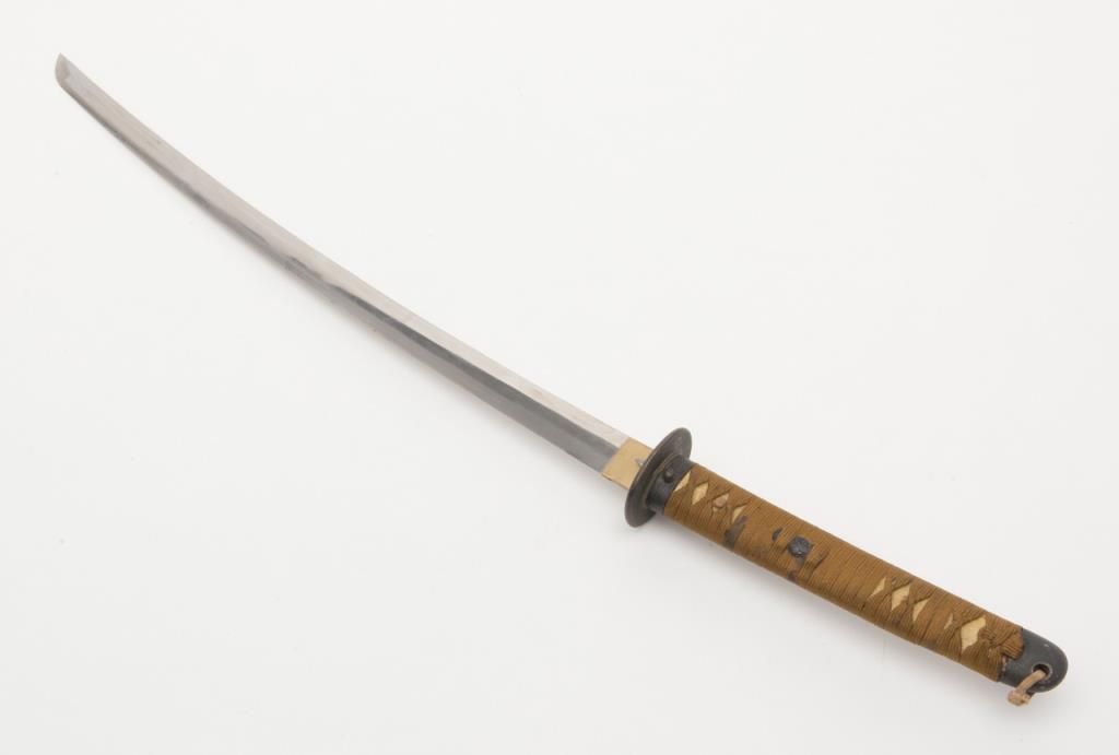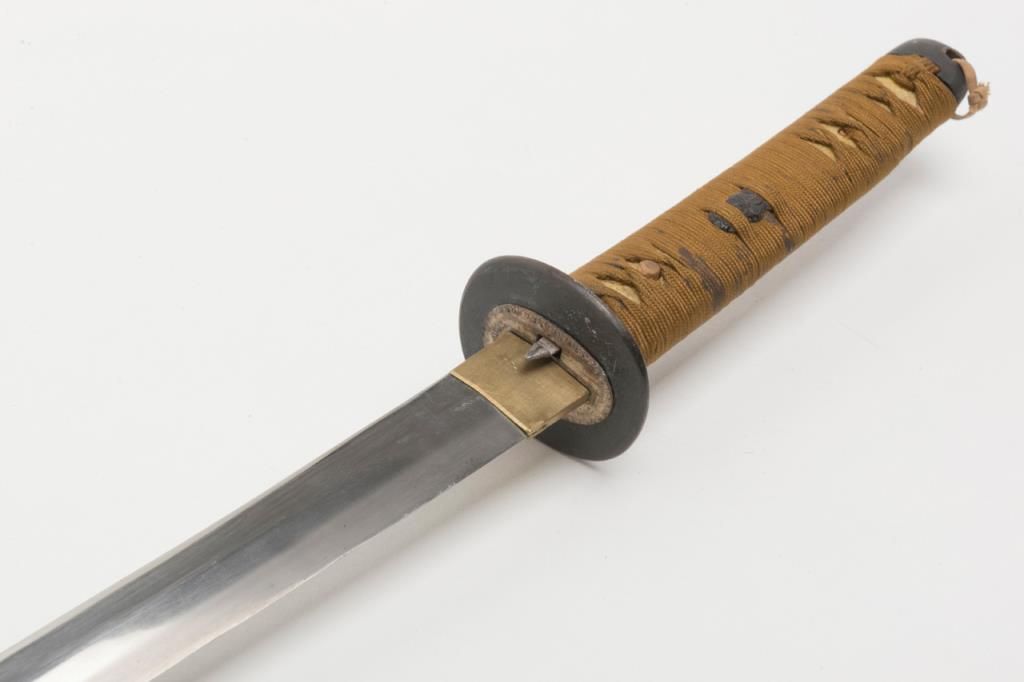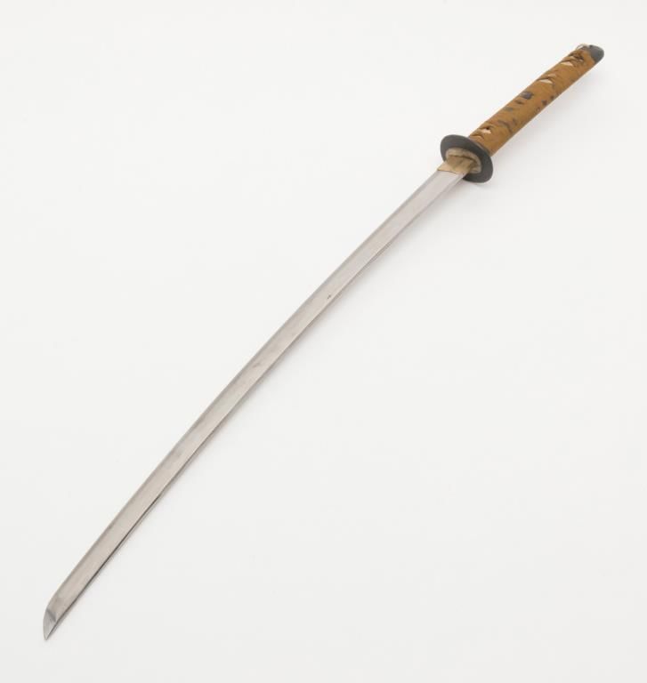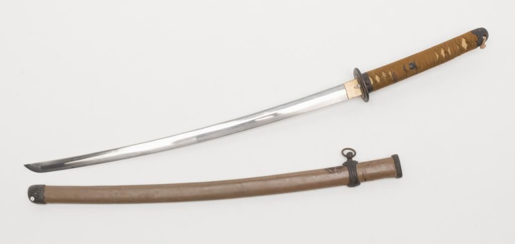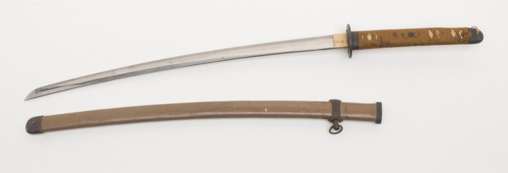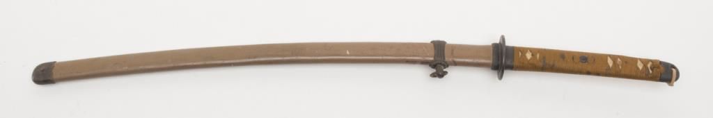 Japanese Katana sword in military mounts in overall good condition with metal scabbard, cord wrapping with two menuki, un-adorned tsuba. Est.: $350-$700.