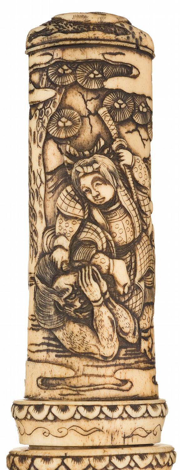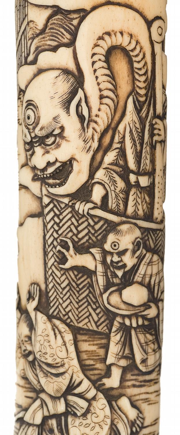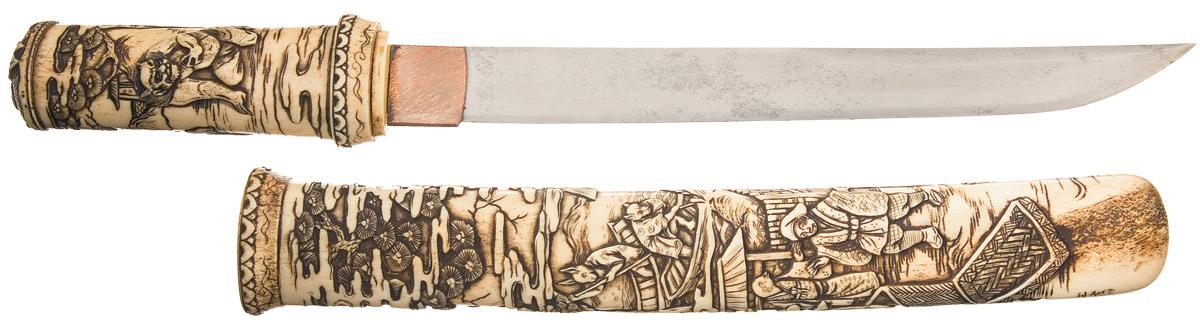 Blade is 8 1/2" in length, with a faint simulated temper line and a silver finished textured copper throat. The hilt and sheath are both carved bone with extensive raised designs, with the latter signed with a set of three symbols near the tip. The grip is carved with a wraparound woodland scene of a warrior grabbing a demon by the hair and sticking his knee in its neck while a second demon looks on, and a design of a monkey wearing a shirt and holding a peach on the pommel. The sheath is decorated with a scene of a man being assaulted in a market by a 3-eyed demon with a snake for a neck, with a number of onlookers with both human and animal heads, and raised cherry blossoms and birds in flight at the throat.