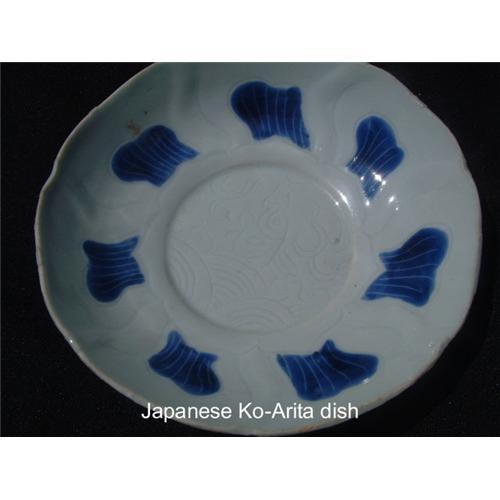 Edo period Ko-Arita porcelain dish decorated with seven blue decorations and an incised pattern design on the bottom. It has a scalloped edge that is intact. Diameter 6" (15 cm.). Estimated retail value: $2500.