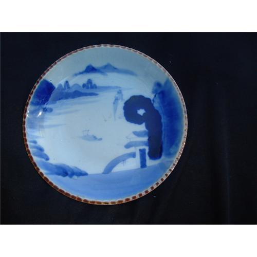 18th. century Japanese Ko-Arita with enchanting landscape decor in under-glaze blue/white decoration. Scalloped, gilded edge. Diameter: 8.5" (21.5 cm.). Estimated value: $1200.