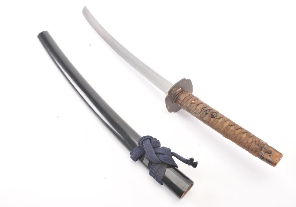 Japanese (Ko-Wakasashi) medium size Samurai sword in traditional mounting with an 18” blade signed on both sides, over 400 years old. The temper is fully visible on the cleaned blade (not Japan) with good, oldmounts and a WWII type grip. Est.: $1000-2000