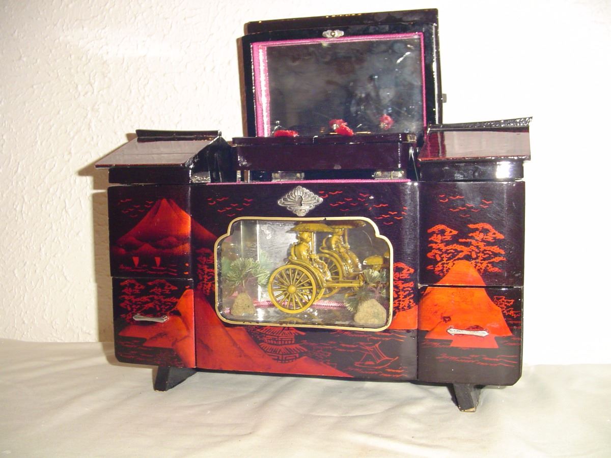 Japanese Lacquered Mechanical Jewel Box Wheels On Cart Turn + Music