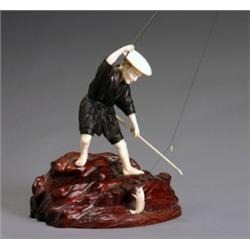 Japanese Large Ivory Mounted Bronze and Wood Okimono of a Fisherman
