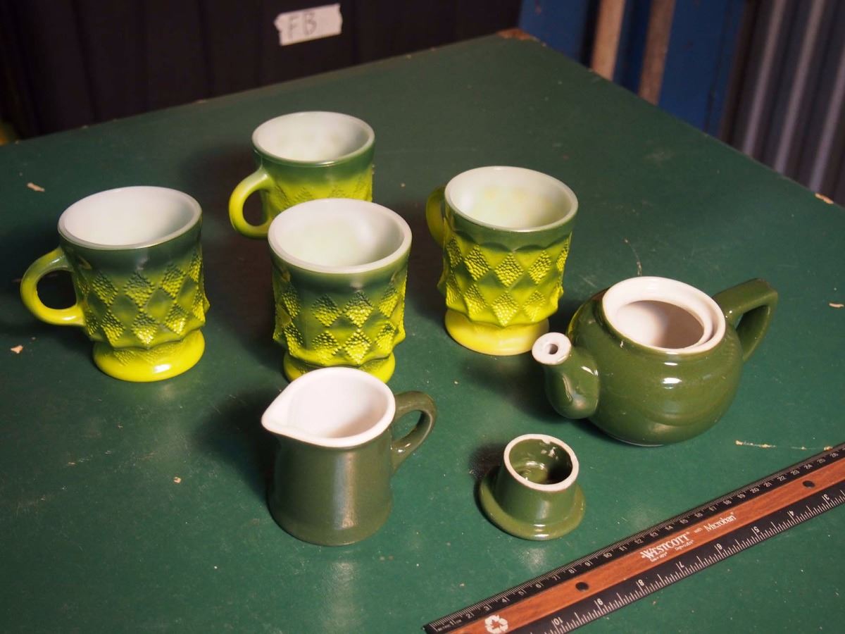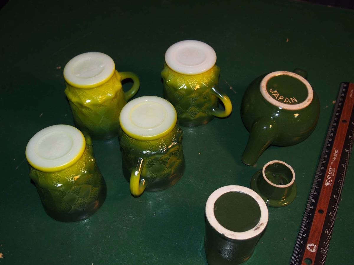 Japanese Made Tea Pot And Creamer W/ Set Of Fire King Mugs