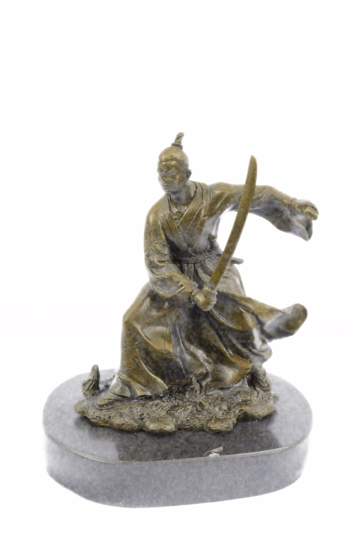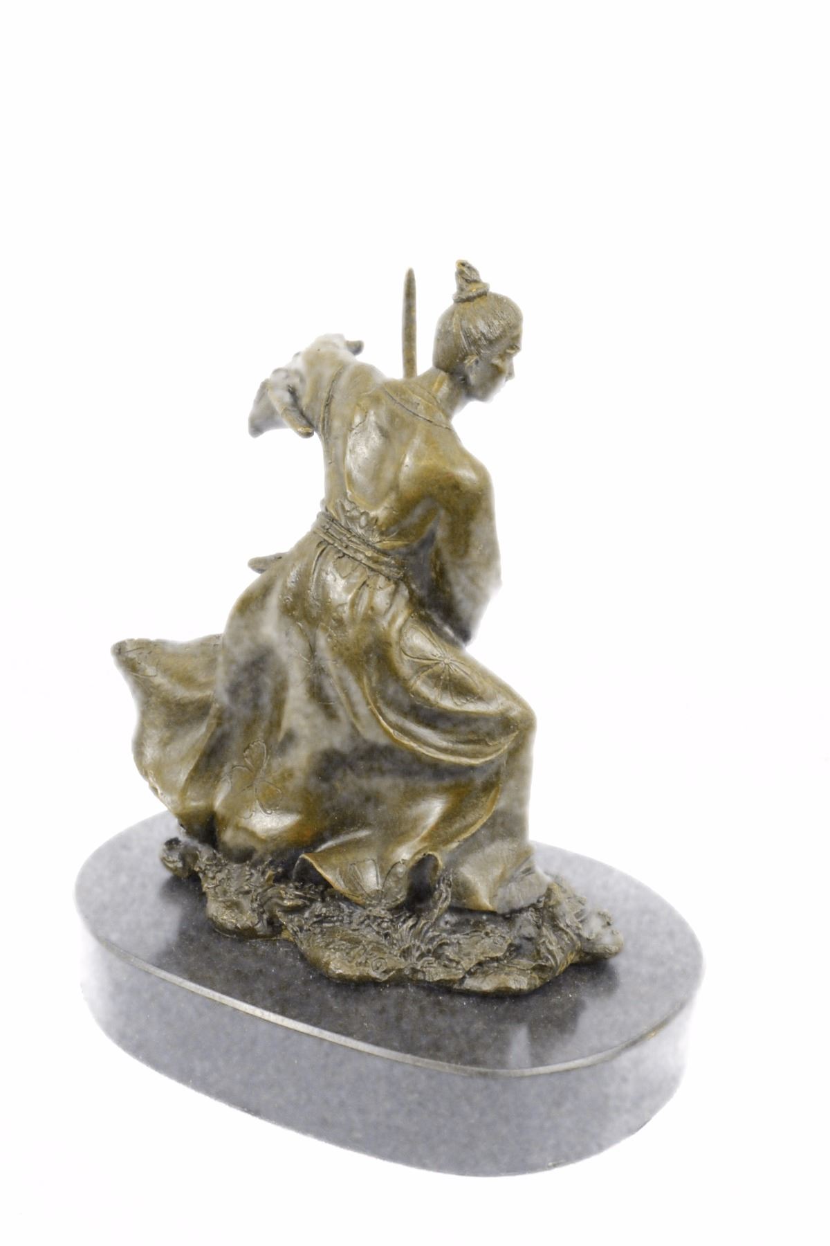 This Asian Man Is Doing His Normal Routine, As He Practices Hismartial Arts With His Sword. As Steady As He Can Be, He Takes His Time Making Sure He Does Not Make Any Mistakes. In Martial Arts Its All About Consistency And Patience, Without One Or The Other It Is Impossible To Keep All The Work You Put Into It Well Done. He Is Wearing A Long Robe That Ties Around His Waist And Has These Beautiful Flower Decoration All Around It. His Hair Is Tied Slick Back Into A High Neat Bun, To Make Sure He Does Not Get Any Hair In His Face While He Practices. This Sculpture Was Cast Using The Ancient Old Lost Wax Method Stained In Brown Patina Finish For Preservation and Mounted Atop A Black Marble Base. Bronze dimensions with marble base: Height 8 X Width 5 inches. Weight: 7 lbs.Please Note: This is a reproduction bronze sculpture from the original molded and signed. This featured bronze sculpture is a recast after the original, and has been done recently. This 100% bronze sculpture is an abstract piece certain to be a conversation piece.Please Note: This is a reproduction bronze sculpture from the original molded and signed. This featured bronze sculpture is a recast after the original, and has been done recently. This 100% bronze sculpture is an abstract piece certain to be a conversation piece.