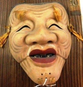 Japanese Mask Mounted on wood, made from a ceramic material. The item is painted with chin and eyebrow hair. The mask measuring 7 by 6 inches. Shipping $18.00 Good condition with some hair loss and slight scuffs