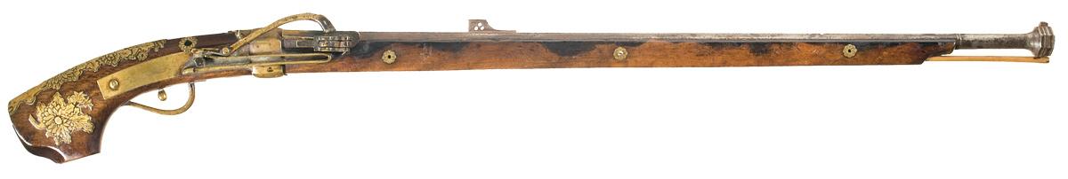 Blade front and notch rear sights, with a flared cannon muzzle, brass lock with exposed spring and sear, touchhole cover, pipe guard and ball trigger. Smooth mahogany stock, with a replacement ramrod, three floral escutcheons on each side of the forearm and extensive floral brass plate decoration on the butt.