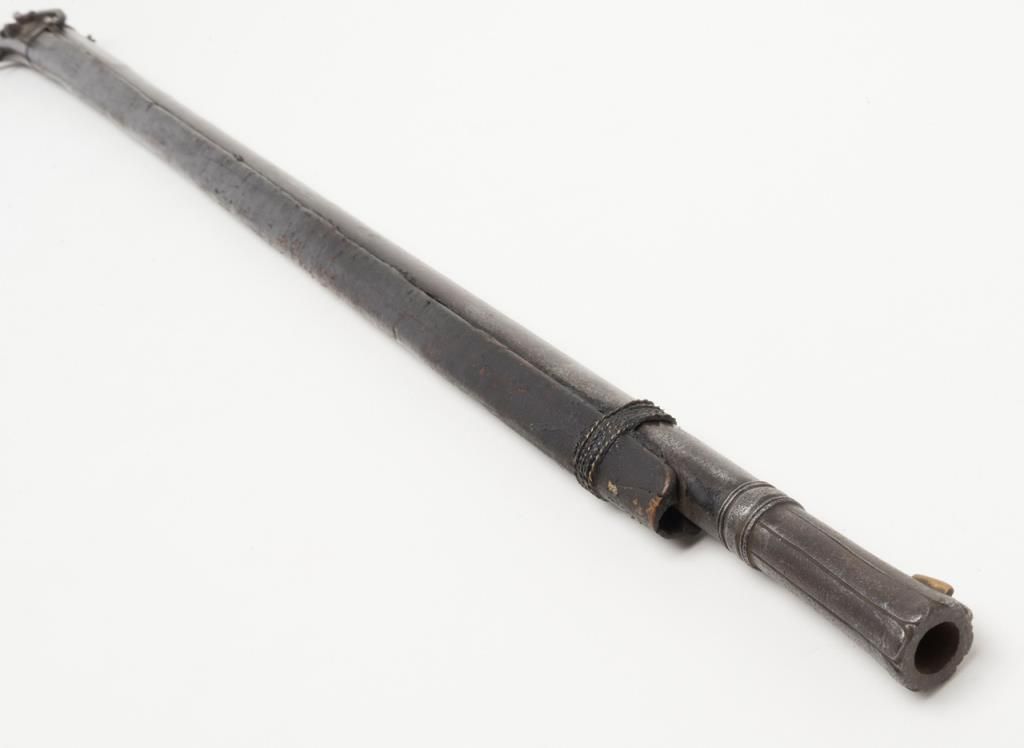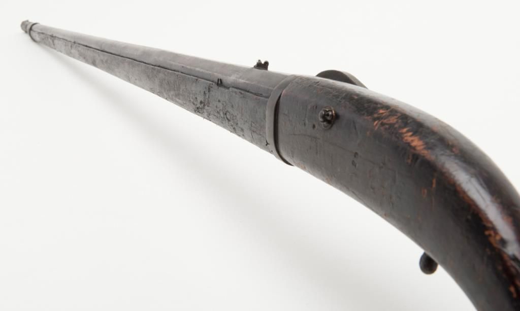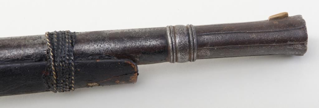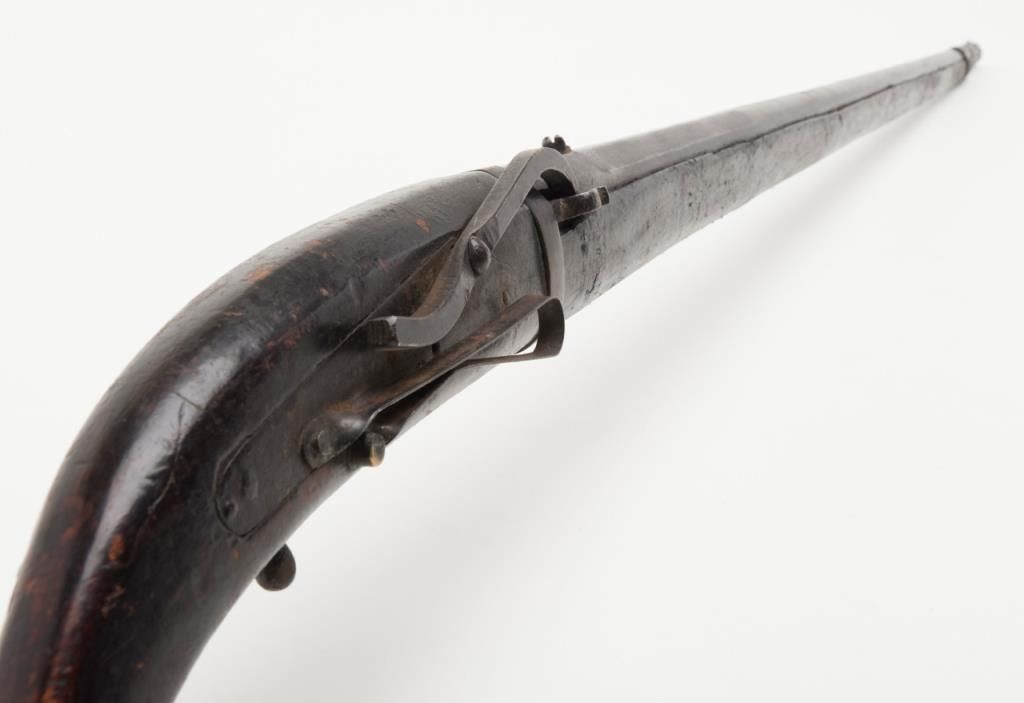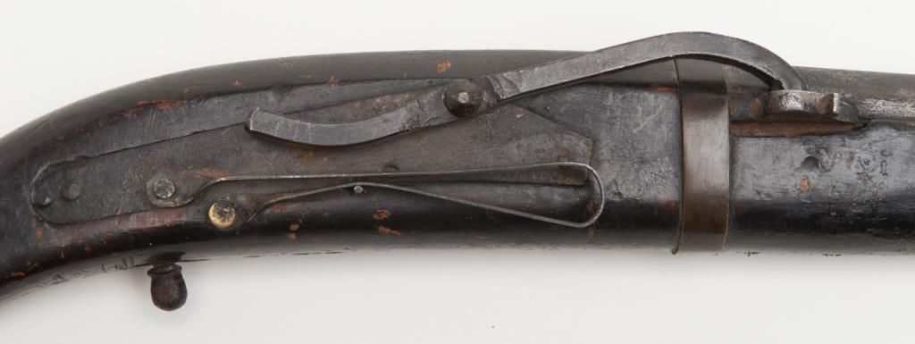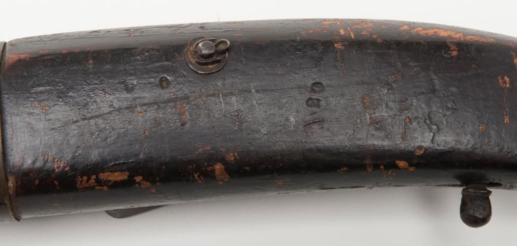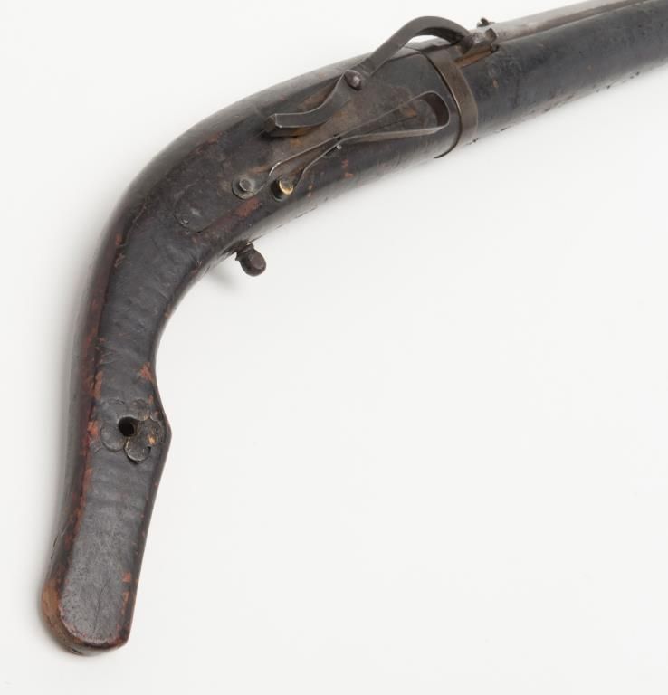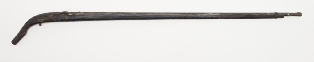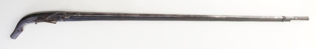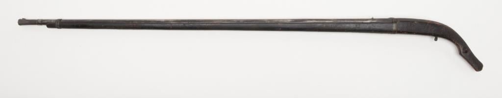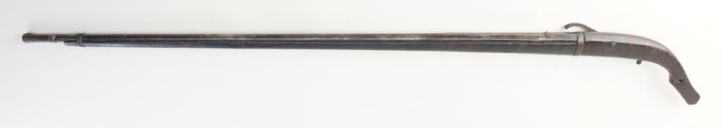 Japanese Matchlock rifle, .48 cal., 46” cannon barrel, full wood stock in overall fair un-cleaned condition; old black paint to stock with “29 stamped on left side of stock near wrist; lots of character! (Antique). Est.: $150-$300.