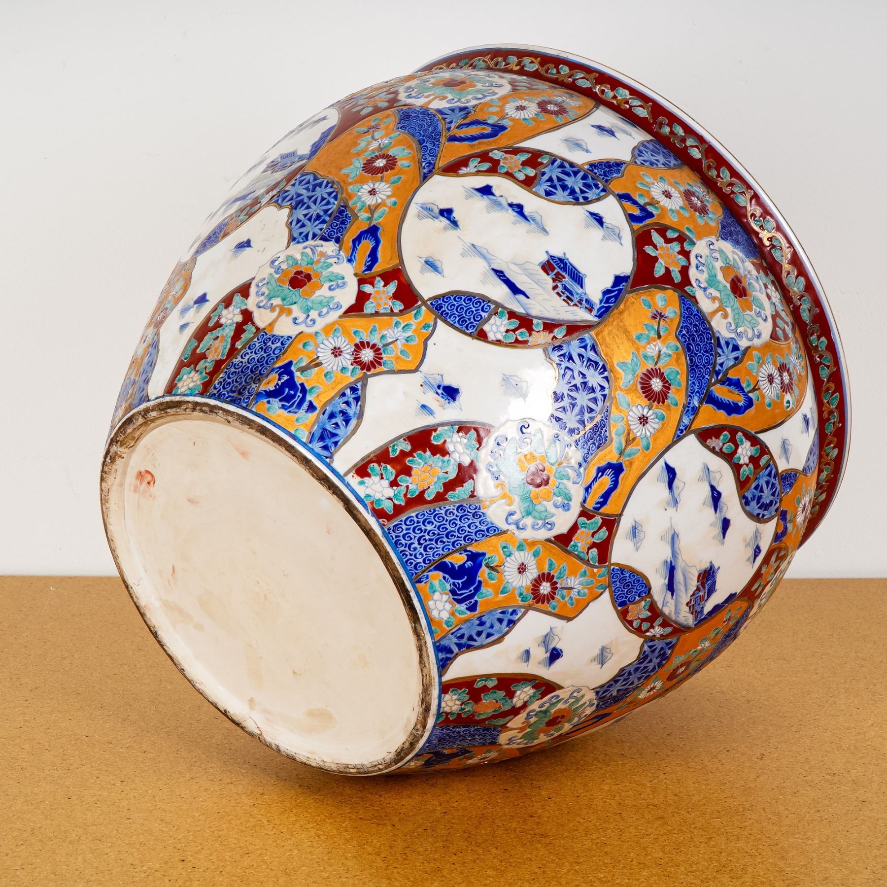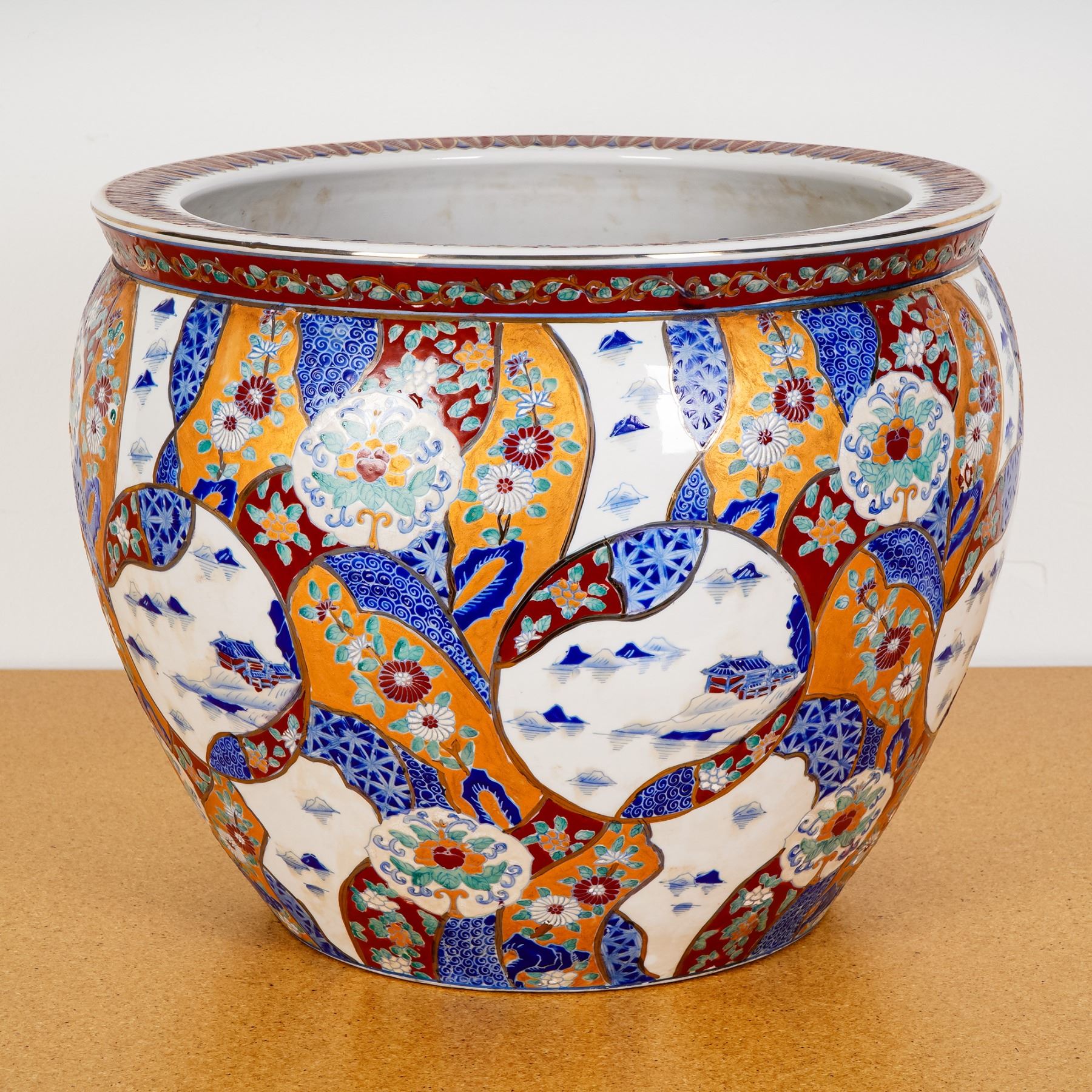 A striking and elaborately decorated Japanese Imari porcelain fish bowl, likely Meiji period (late 19th to early 20th century). This large, globular vessel is adorned on the exterior with a profusion of intricate patterns in a rich Imari palette of deep cobalt blue, iron red, and gold, featuring alternating cartouches depicting stylized chrysanthemum blooms, scrolling foliage, and serene landscape scenes with pavilions and distant mountains. The interior is equally captivating, painted with graceful red goldfish swimming amongst delicate green aquatic plants, all encircled by a finely patterned red and blue feathered border along the rim. The base is unglazed, showing light wear consistent with age. Measuring generously in size, this vessel would have originally served as a koi or goldfish bowl and remains a beautiful example of Japanese artistry and craftsmanship, blending utility with ornamental beauty. Ideal for display or as a statement piece in a curated interior, it is in good vintage condition with minor wear commensurate with age and use.