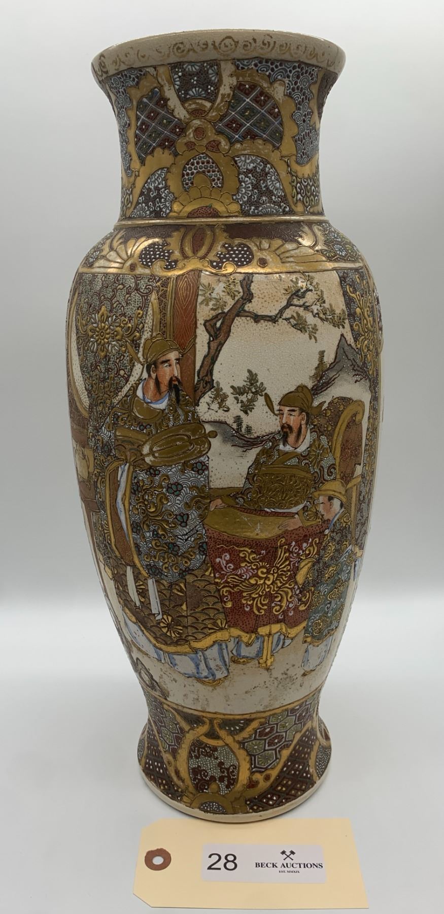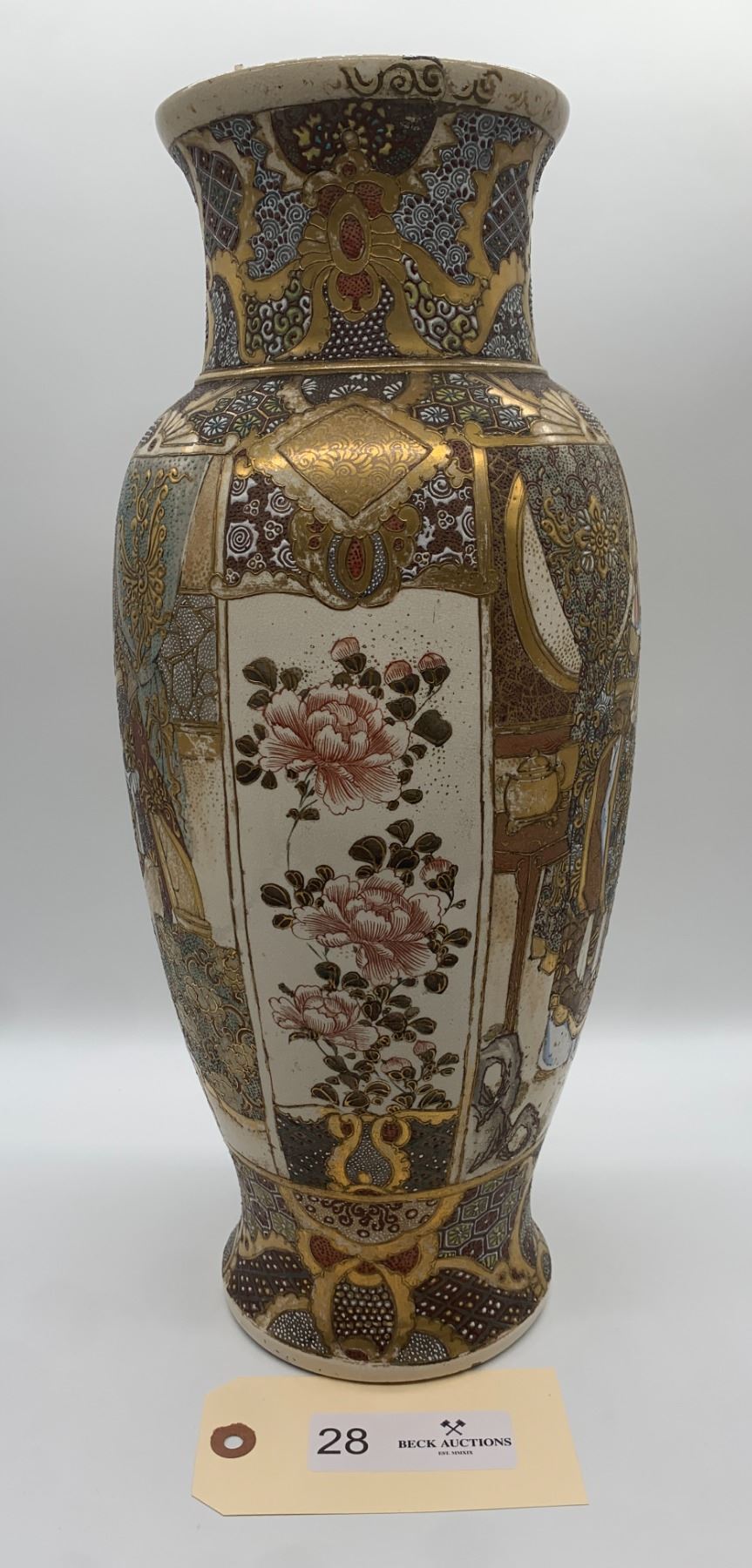 Japanese Meiji Satsuma Vase 1900-1930 16.5" Inches Tall. A painted Satsuma vase from the Meiji period. With a traditional palette of gold, red and blue enamels with gold accents. Wear and loss to gold paint throughout, predominantly around rim and base.