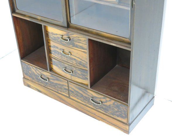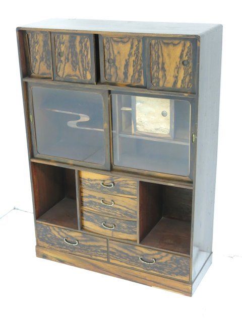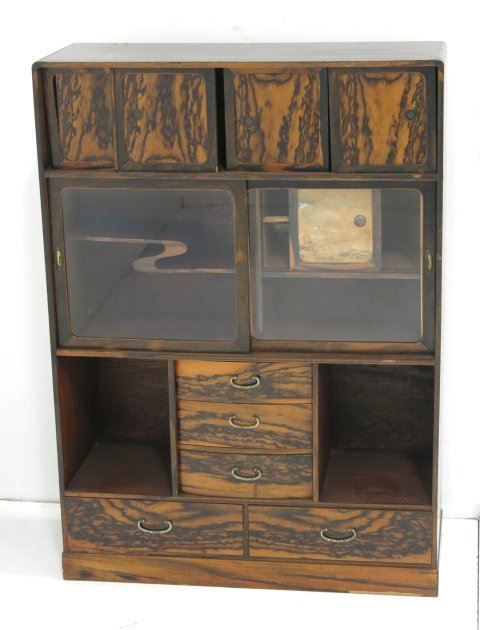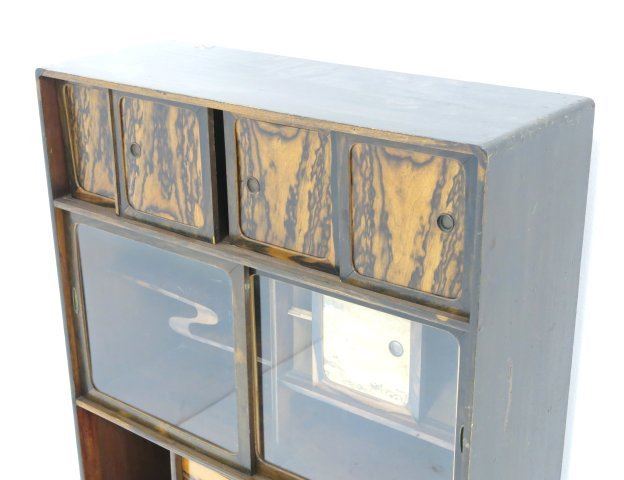 Approx. 41 1/2"H x 29 3/4"W x 11"D sliding doors slightly warped minor chips, paintings slightly stained, veneer damage to feet