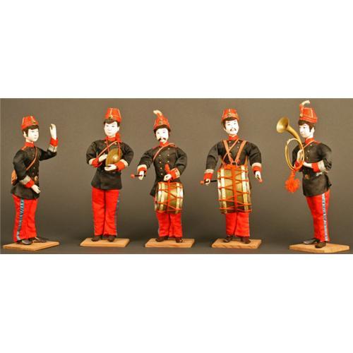 Extremely Rare Japanese Set of Five Military Band Musicians from the Russo-Japanese War of 1904-5. We knew of this one-of-a-kind complete set 15 years ago, and have finally just now been allowed to purchase it. These rare sets were produced only during the Russo-Japanese War, and you will likely never see another being offered. Japan used these Ningyo for the Boys Day Festival during this time in history. Heights range from 10.5 to 11.5 inches, 26.5 to 29 cm. Excellent Condition.