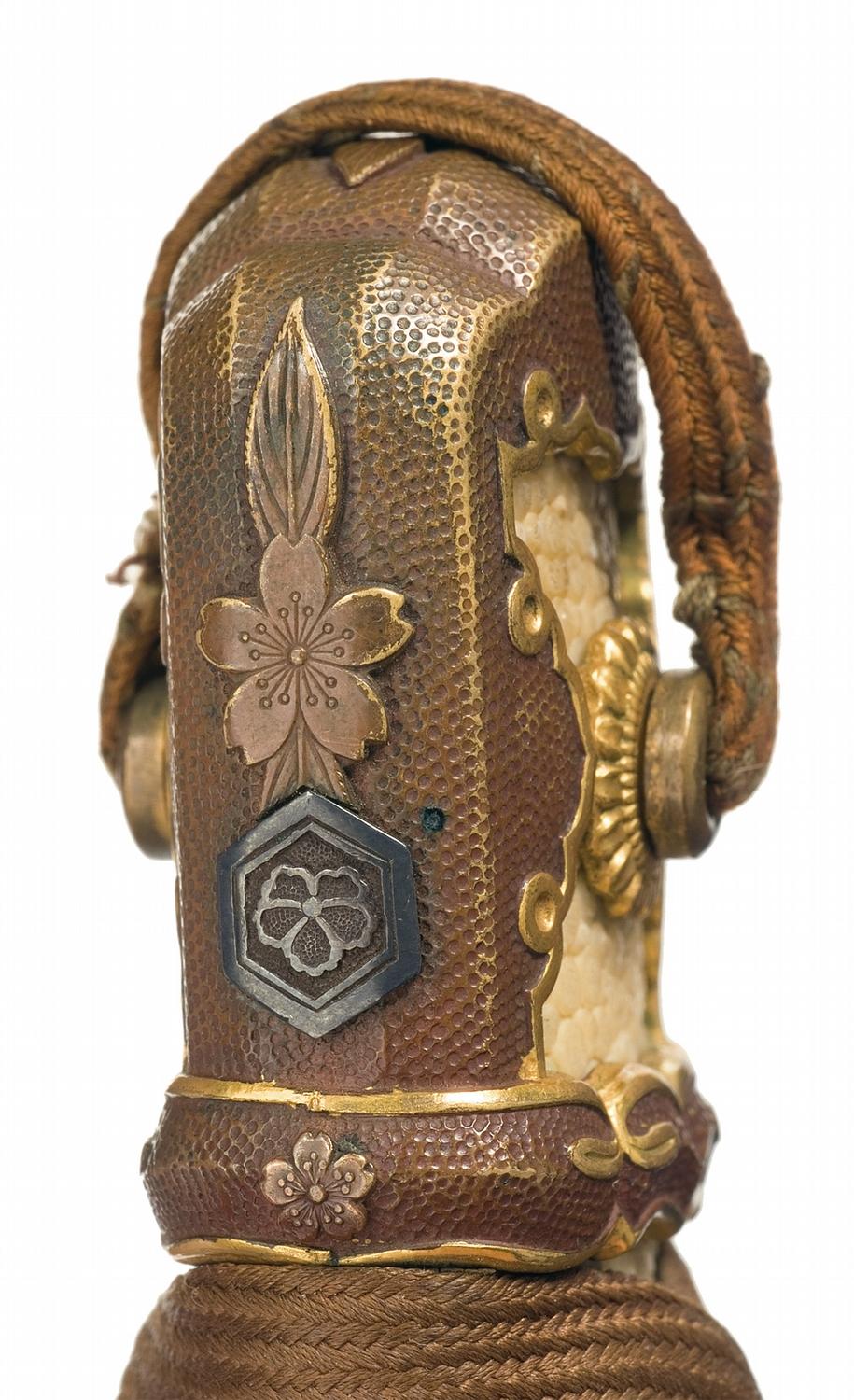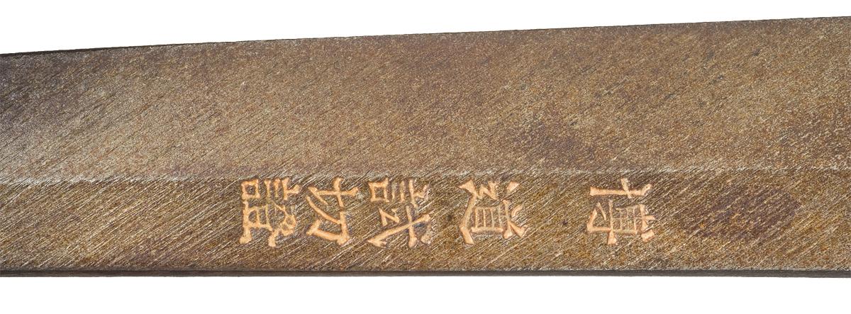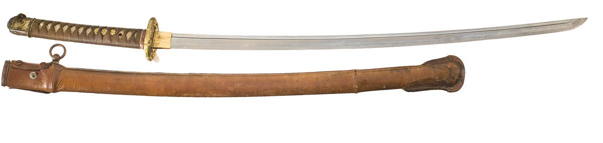 Blade is 26 1/4" long, with a smooth hamon, gold finished copper habaki, and silver and gold seppa. Gilt finished brass tsuba, with chrysanthemum designs and gilt finish. Military style tsuka, with brown cord wrap, military menuki, and a silver family mon seal applied to the rear of the kashira. The nakago is hand signed (four symbols) on the right side, with an additional 5 stamped symbols on the left. Military saya, with leather cover.