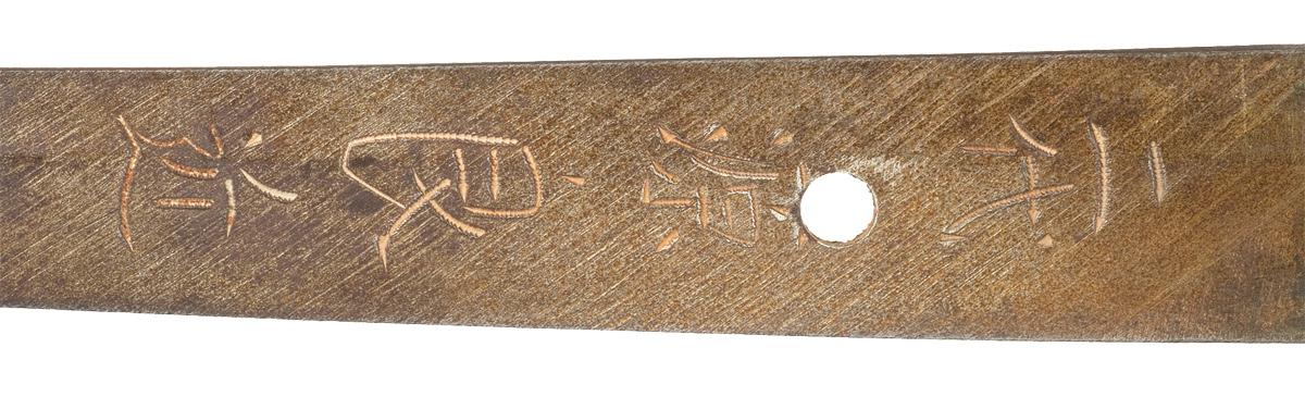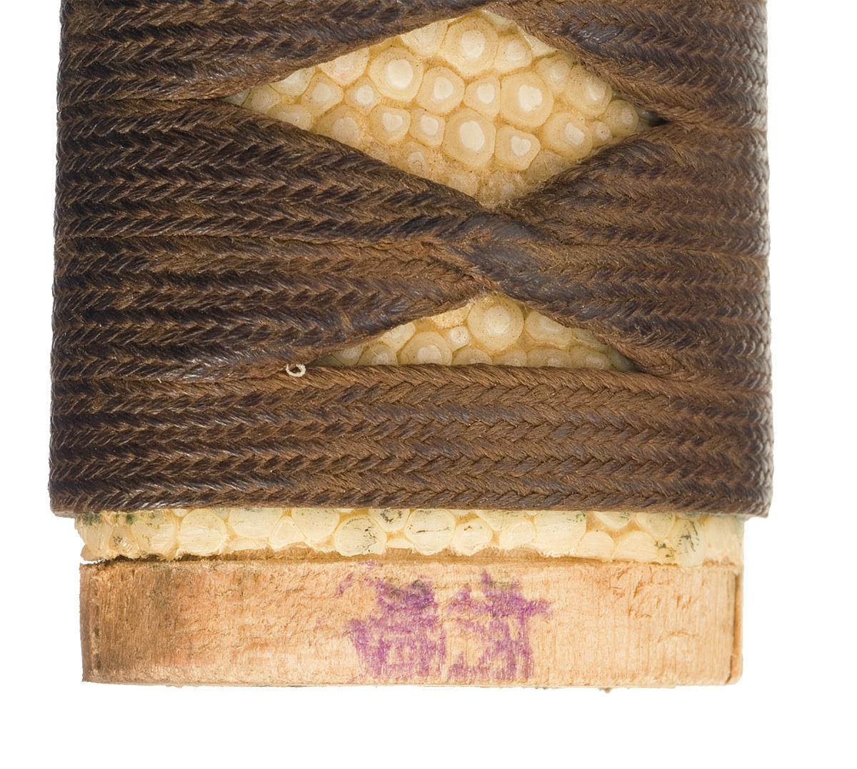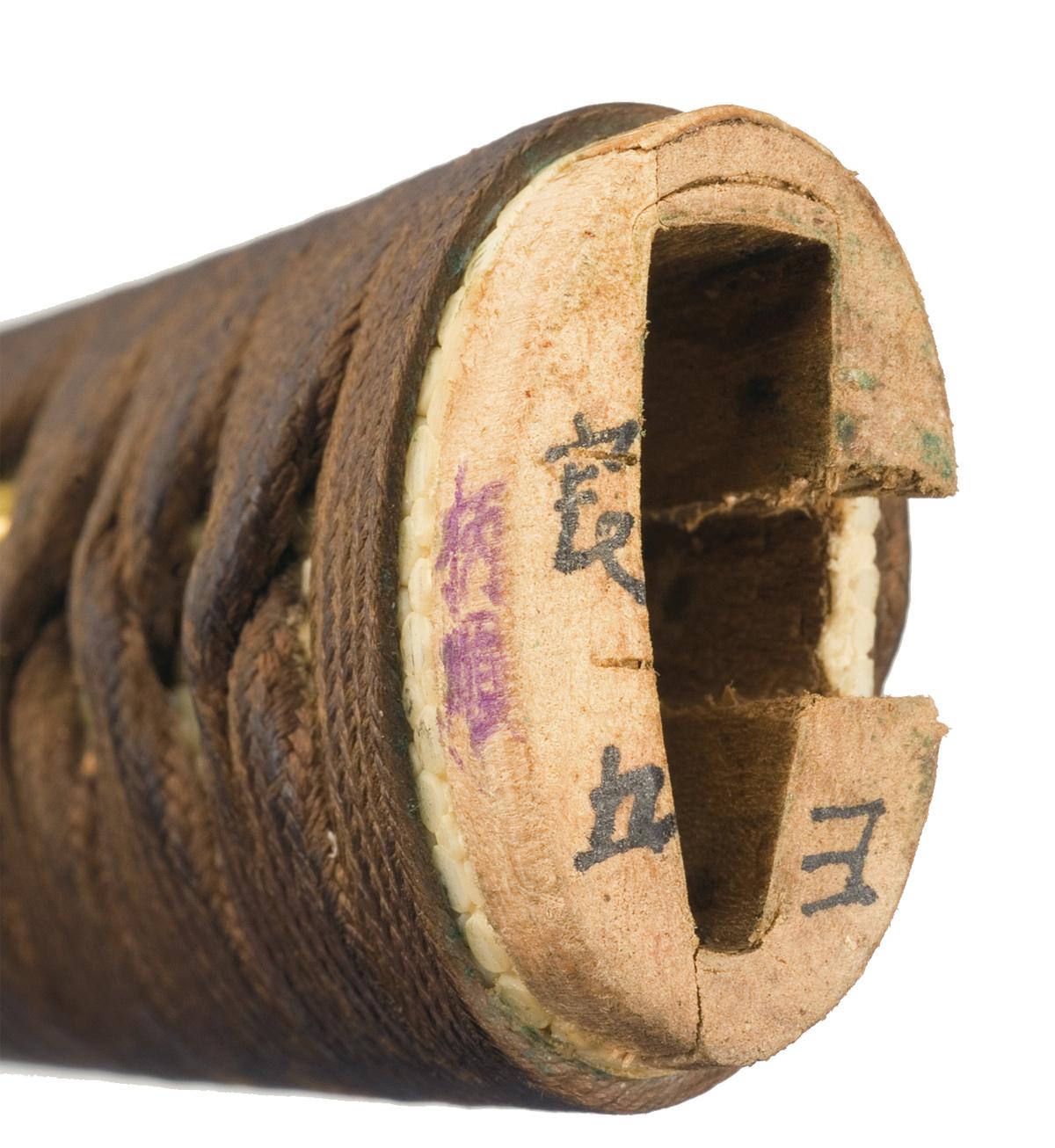 Condition: Excellent. A few small scratches are visible on the blade, along with a tiny amount of pitting on the left side near the habaki. Hamon is very strong, and the gilt components retain over 85% of the original finish. A small amount of staining is visible on the wrap. The mekugi is absent. The leather sheath cover is good, with some scuffs and wear.