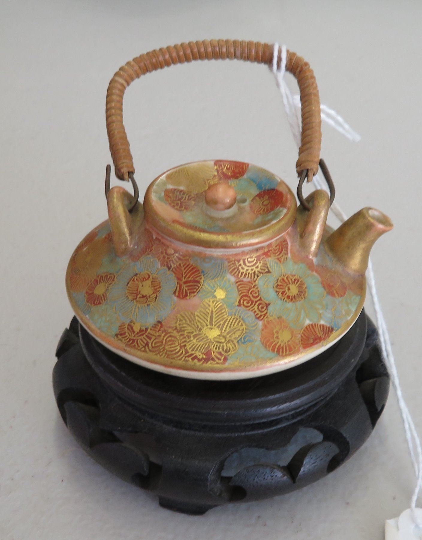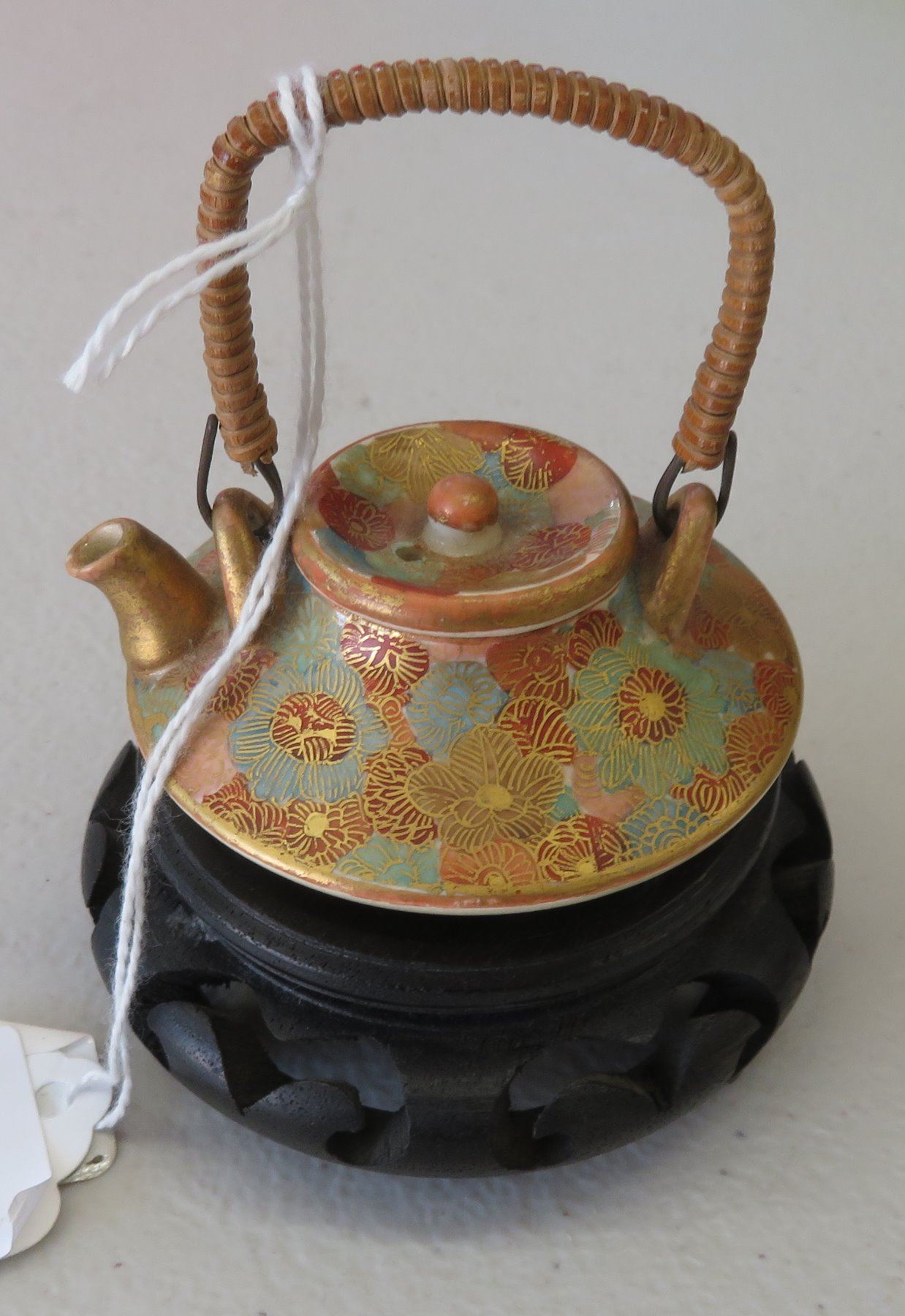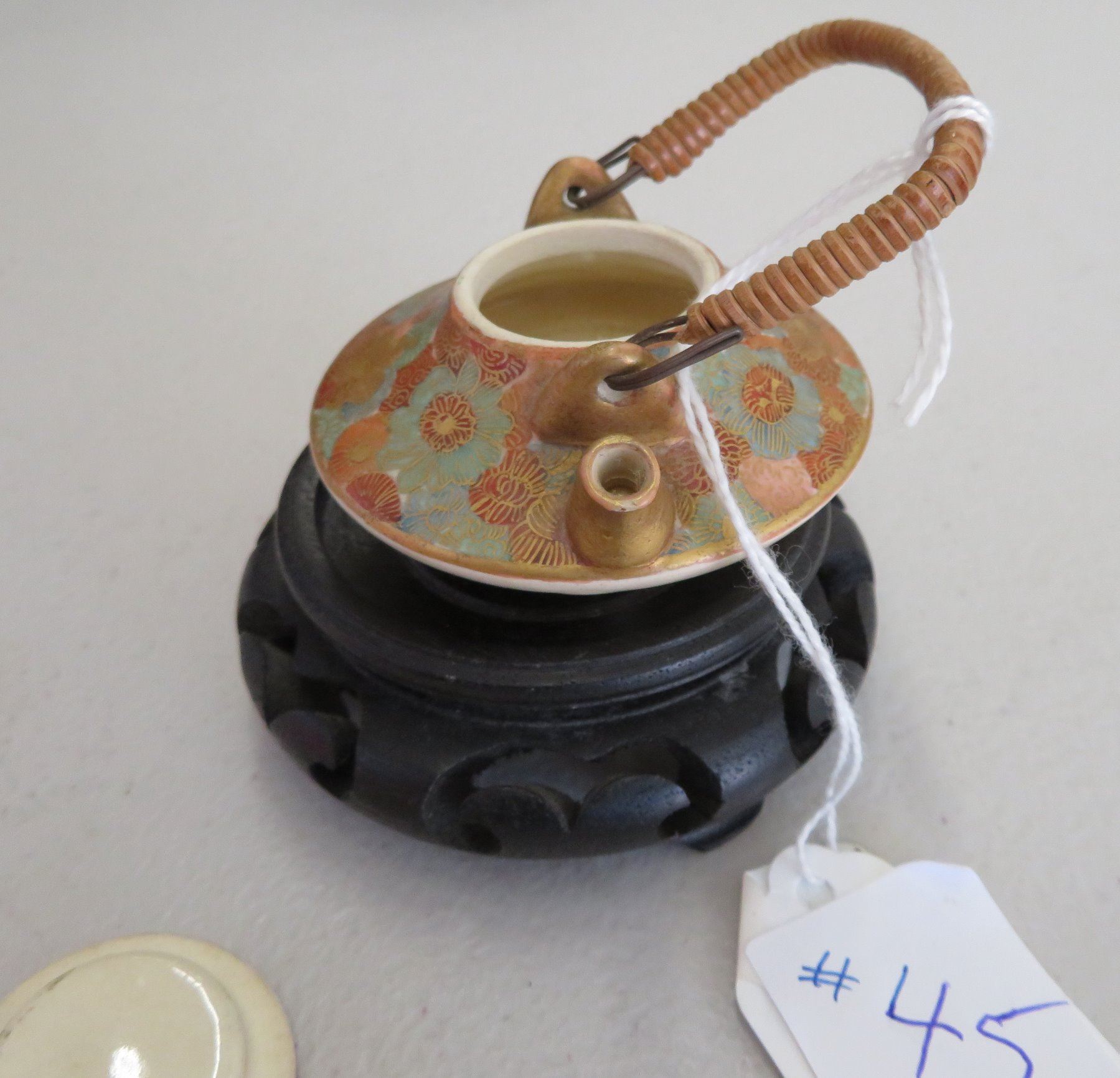 Japanese Mini Tea Pot on Stand, 19th century item. Made of wood and porcelain, the item measures 2 1/2" x 2 1/2" with stand. Japan, Chinese stand. Condition: Good, see images. Shipping: $15.50 w/insurance and signature.