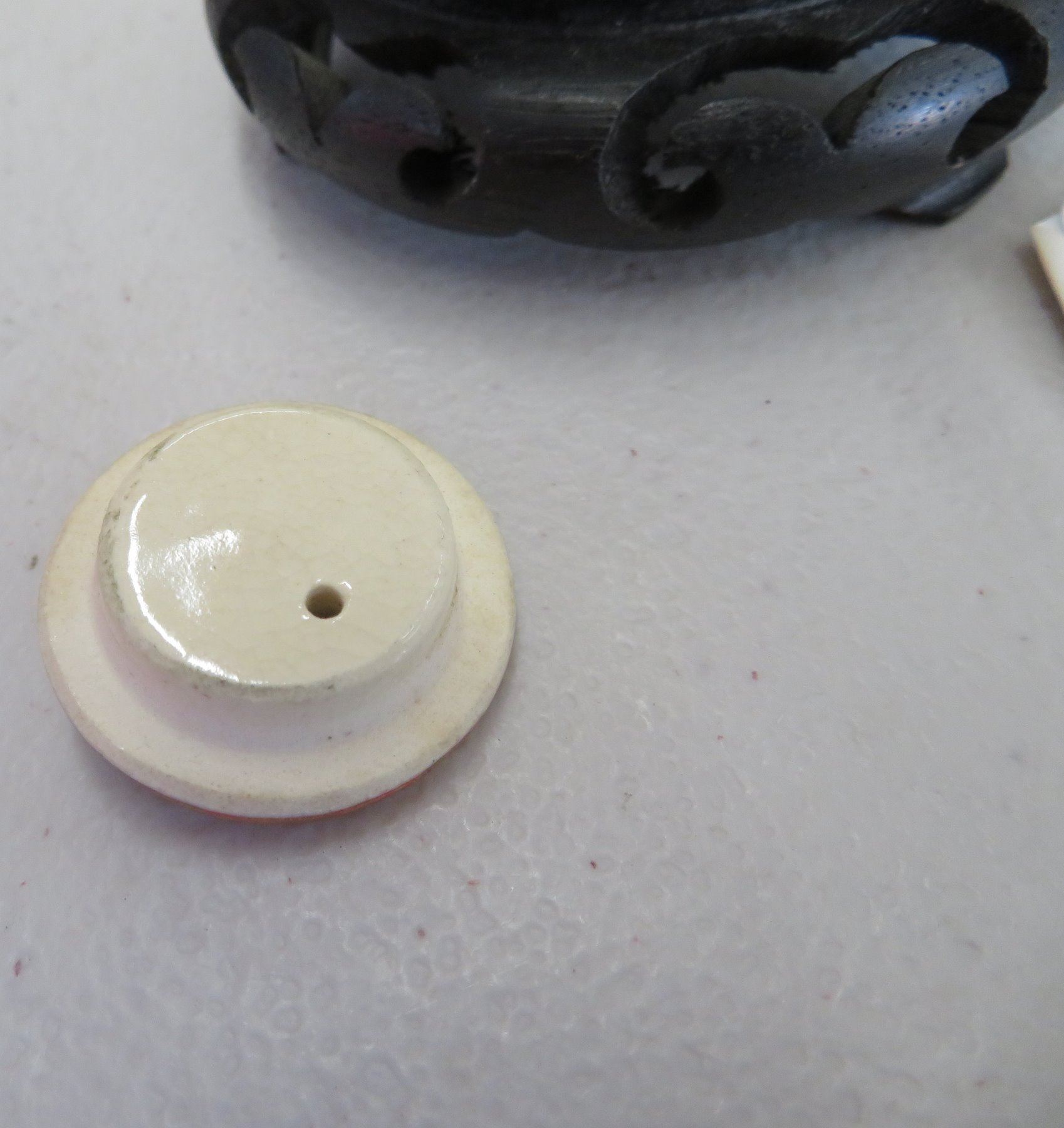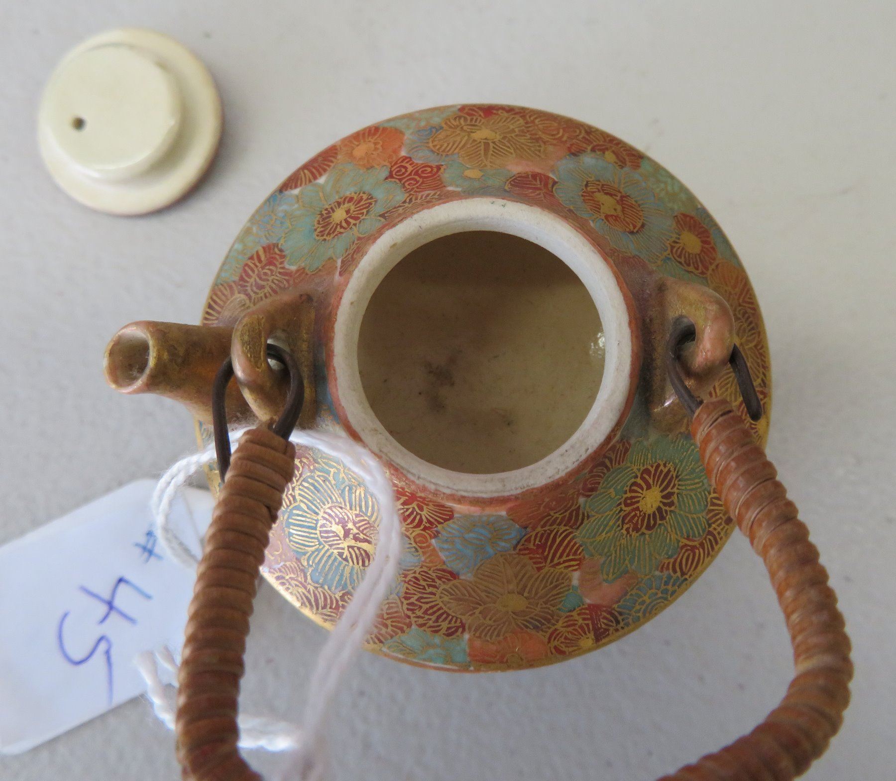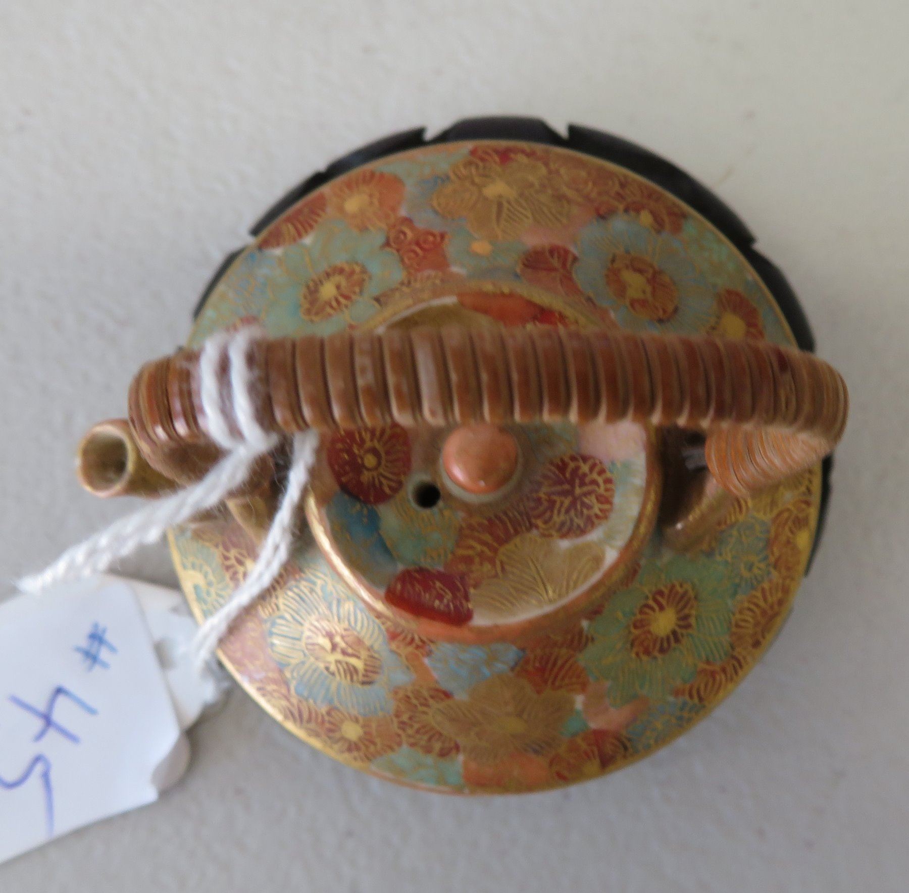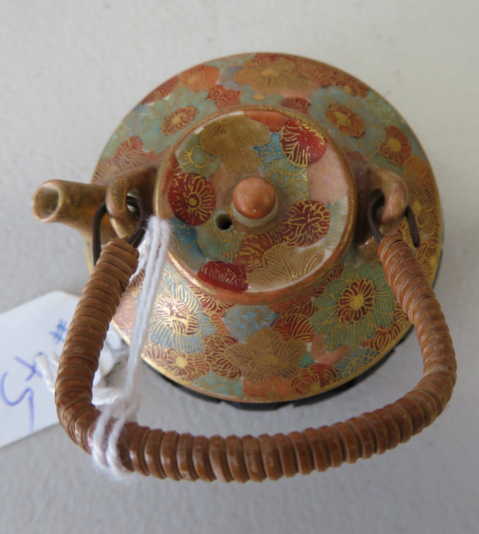 Japanese Mini Tea Pot on Stand, 19th century item. Made of wood and porcelain, the item measures 2 1/2" x 2 1/2" with stand. Japan, Chinese stand. Condition: Good, see images. Shipping: $15.50 w/insurance and signature.
