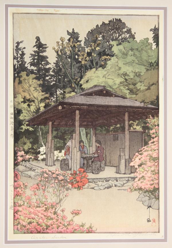 Japanese modern woodblock print, Azalea Garden [in English] and Tsutsuji no niwa (Azalea Garden) [in Japanese], (Abe #200), left margin with date Showa 10 (1935) and jizure notation, bottom margin with pencil signature Hiroshi Yoshida (1876-1950) (traces of glue to top margin, laid down and matted), sight: 15.325''h x 10.25''w, overall: 21.25''h x 16.25''w