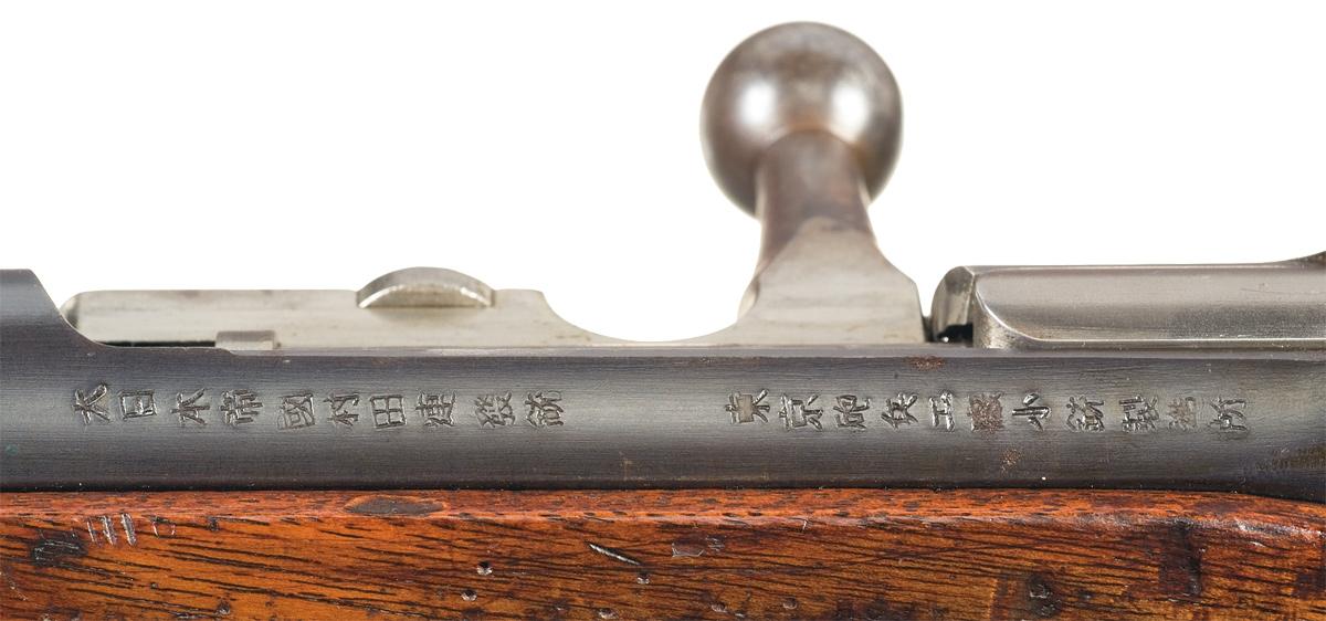 Produced from 1889 to 1899, the Type 22 rifle was Japan's first smokeless powder military rifle. This rifle has inverted "V" front and ladder rear sights, with a clear chrysanthemum on the barrel and Japanese script on the receiver. Matching numbers on the receiver, barrel, trigger guard, floor plate, barrel bands, and bolt. Full length stock with an upper handguard and an exceptionally nice Japanese cartouche stamped on the right side of the buttstock.