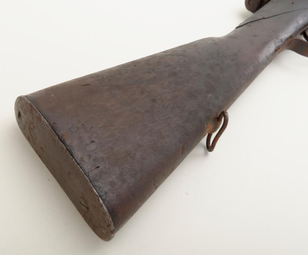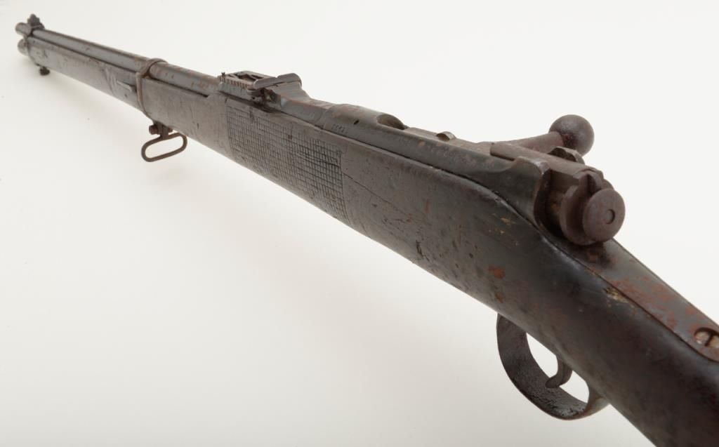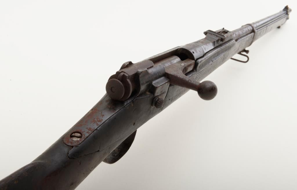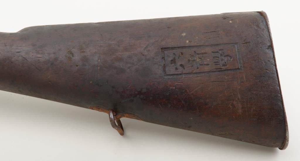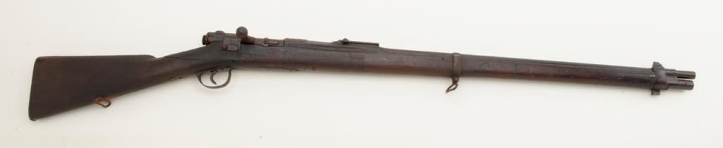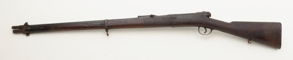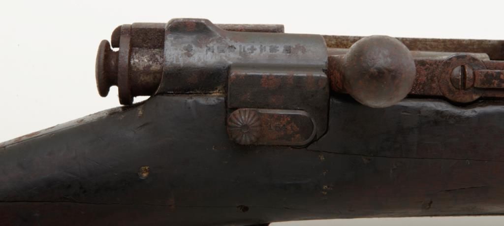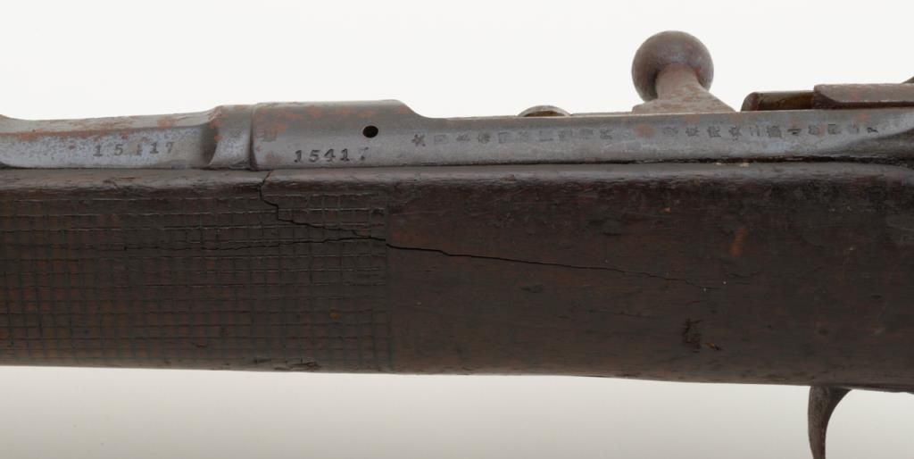 Japanese Murata Type 22 bolt action rifle (Model 1889), 8x53Rmm cal., 29-1/2” barrel with 8 round tubular magazine, wood stock, #15417 in overall fair to good un-cleaned condition showing a dark patina and scattered spots of surface rust from long storage; good bore, action and markings; wood stock shows old crack on right side at wrist and left side below receiver; sharp cartouche on left side of butt stock; would greatly benefit from a careful cleaning and oiling; the standard issue rifle for the Japanese forces in the Sino-Japanese War of 1894. (Antique). Est.: $200-$400.