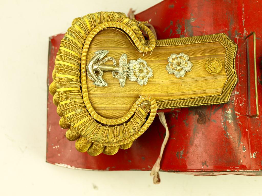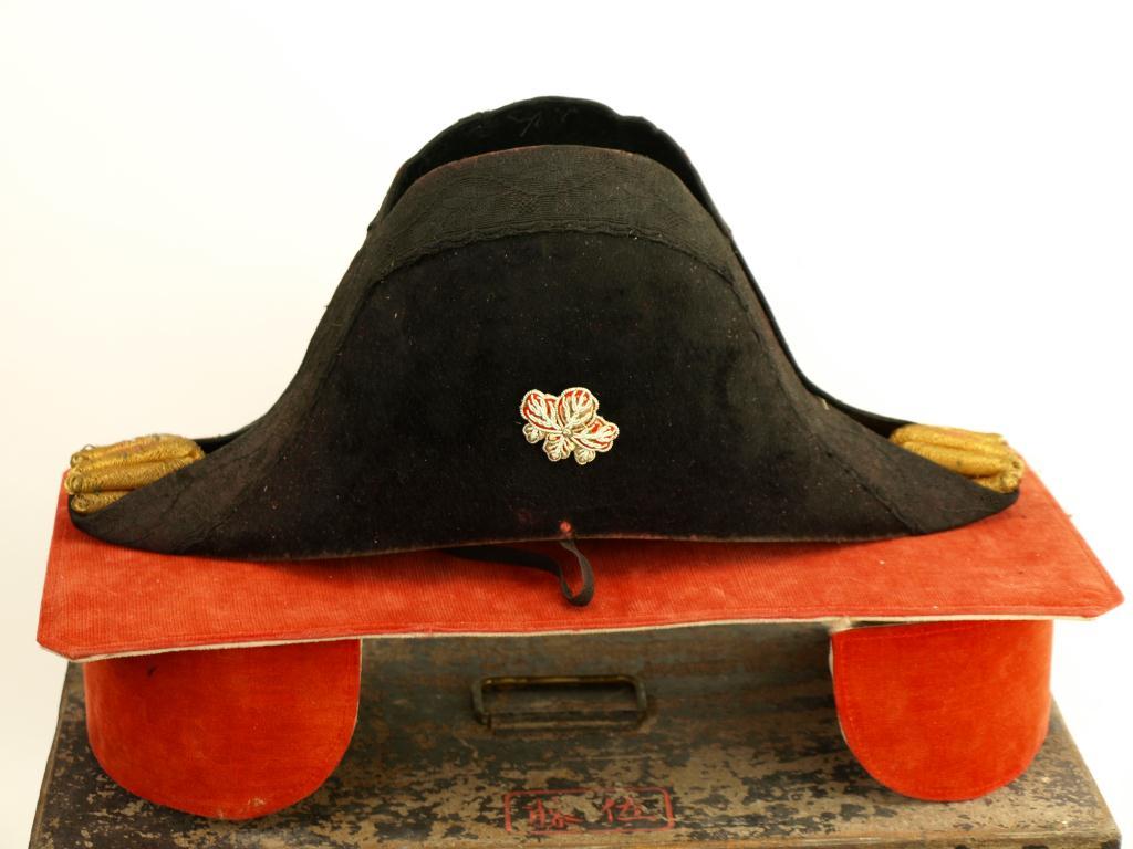 and cocked hat, original japanned carry case. Lid of case and interior of hat marked with officers name includes original Japanese receipt, beautiful set in very good original condition.