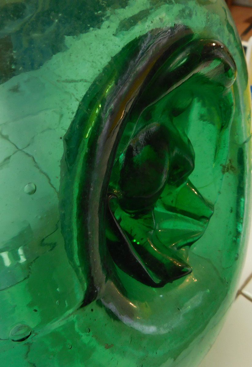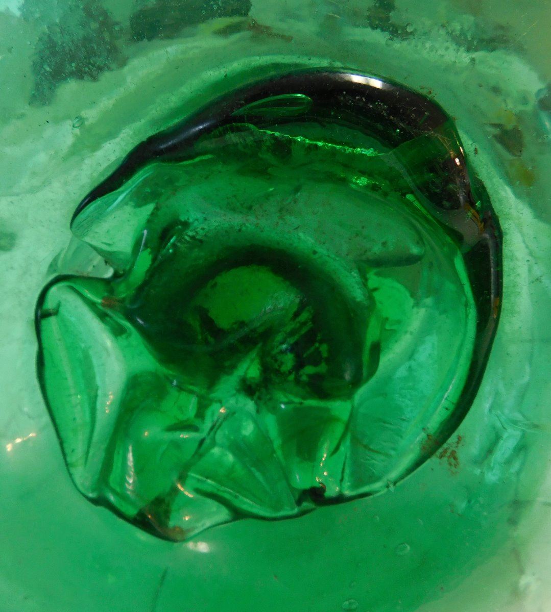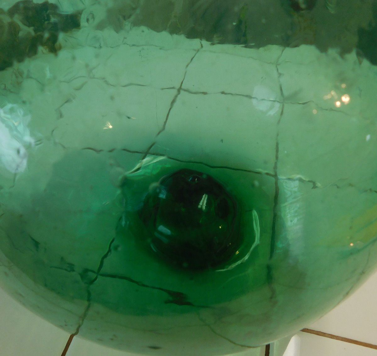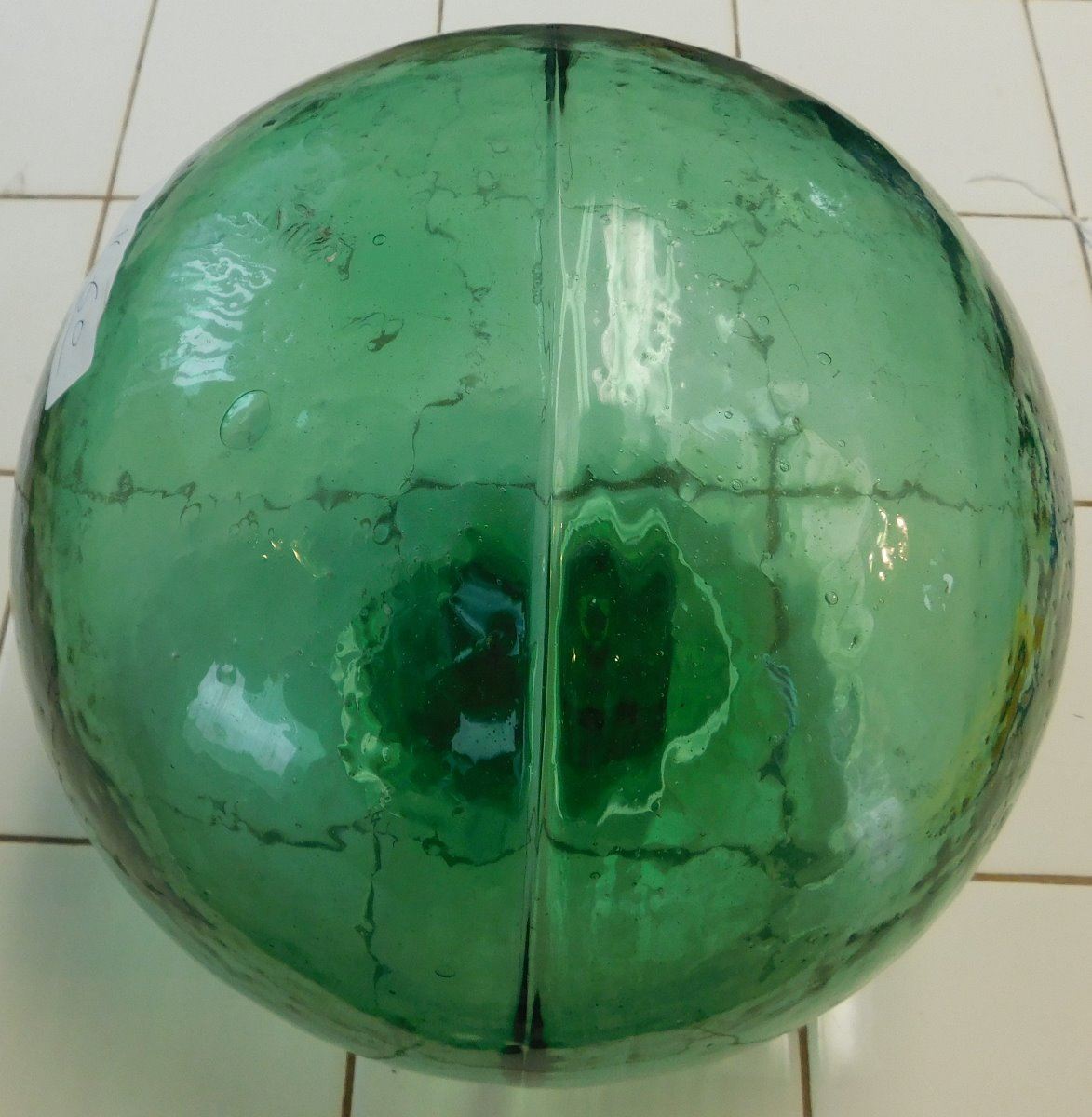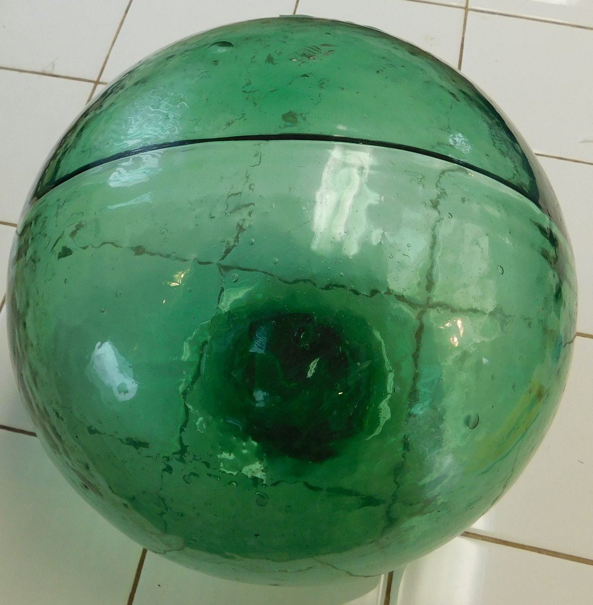 Japanese Net Float, circa 1940s. Made of green glass, the item is 11" x 11" x 11". Found at see off the coast of Hawaii, collected while on a Scripps research vessel. Note extra glass at the base. Condition: Good, bubbles, see images. Shipping: $50.00 USA estimate only, double-boxed w/insurance and signature.