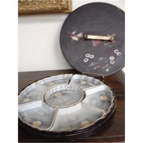 A set of hand painted 1920's Japanese Nippon sweetmeat dishes in a hand painted lacquered box. The top of the box is hand painted in shades of silver and red with a crane and flowers. The handle to the top is engraved bone held on top of two rounded balls by cats. One of the knobs has been replaced. This box measures 12 1/2" in diameter. All the sweetmeat dishes are in excellent condition. There is some use wear to the lacquer on the box but overall in excellent antique condition.