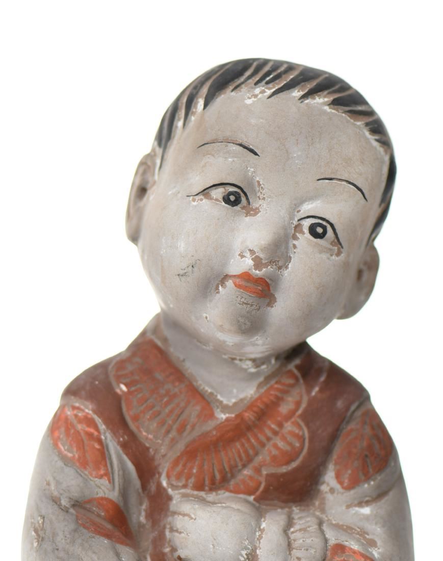 Japanese Polychrome Ceramic Child. Estimated less than 50 yrs old. Japanese art covers a wide range of art styles and media, including ancient pottery, sculpture, ink painting and calligraphy on silk and paper, ukiyo-e paintings and woodblock prints, kiri-e, kirigami, origami, along with a myriad of other types of works of art. The earliest complex art in Japan was produced in the 7th and 8th centuries in connection with Buddhism. In the 9th century, as the Japanese began to turn away from China and develop indigenous forms of expression, the secular arts became increasingly important; until the late 15th century, both religious and secular arts flourished. Painting is the preferred artistic expression in Japan. Until modern times, the Japanese wrote with a brush rather than a pen, and their familiarity with brush techniques has made them particularly sensitive to the values and aesthetics of painting. With the rise of popular culture in the Edo period, a style of woodblock prints became a major form and its techniques were fine tuned to produce colorful prints. The Japanese, in this period, found sculpture a much less sympathetic medium for artistic expression. Japanese ceramics are among the finest in the world and include the earliest known artifacts of their culture. In architecture, Japanese preferences for natural materials and an interaction of interior and exterior space are clearly expressed. (Wikipedia) Size: See Ruler Photo. (Photos Represent The Condition Of The Lot.)