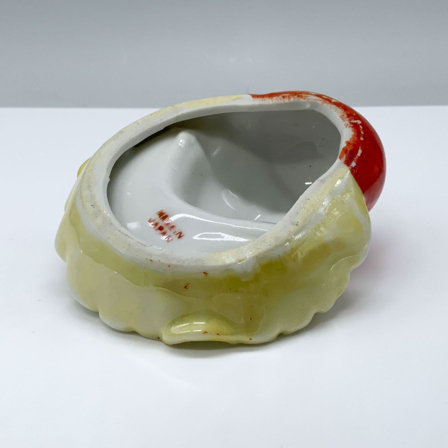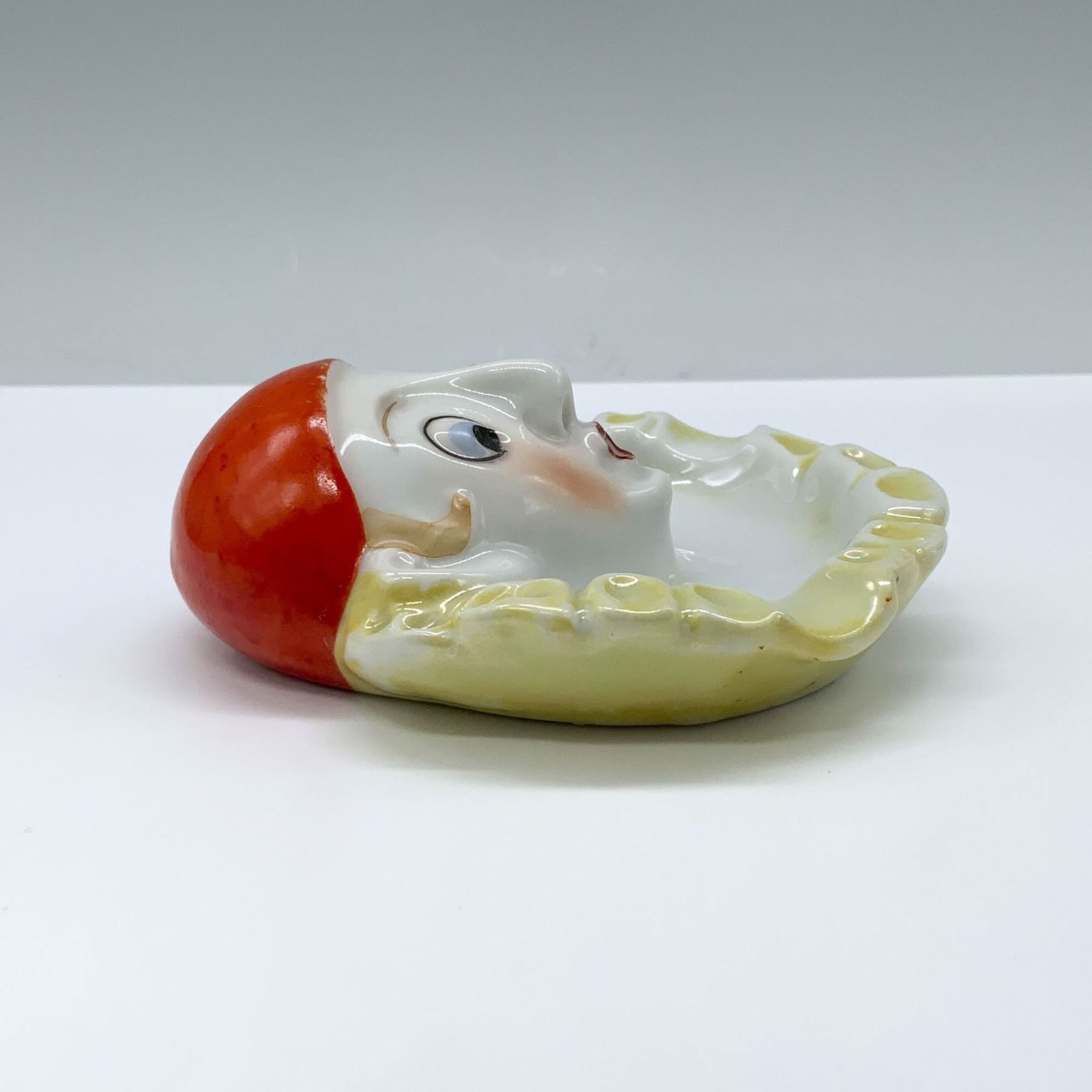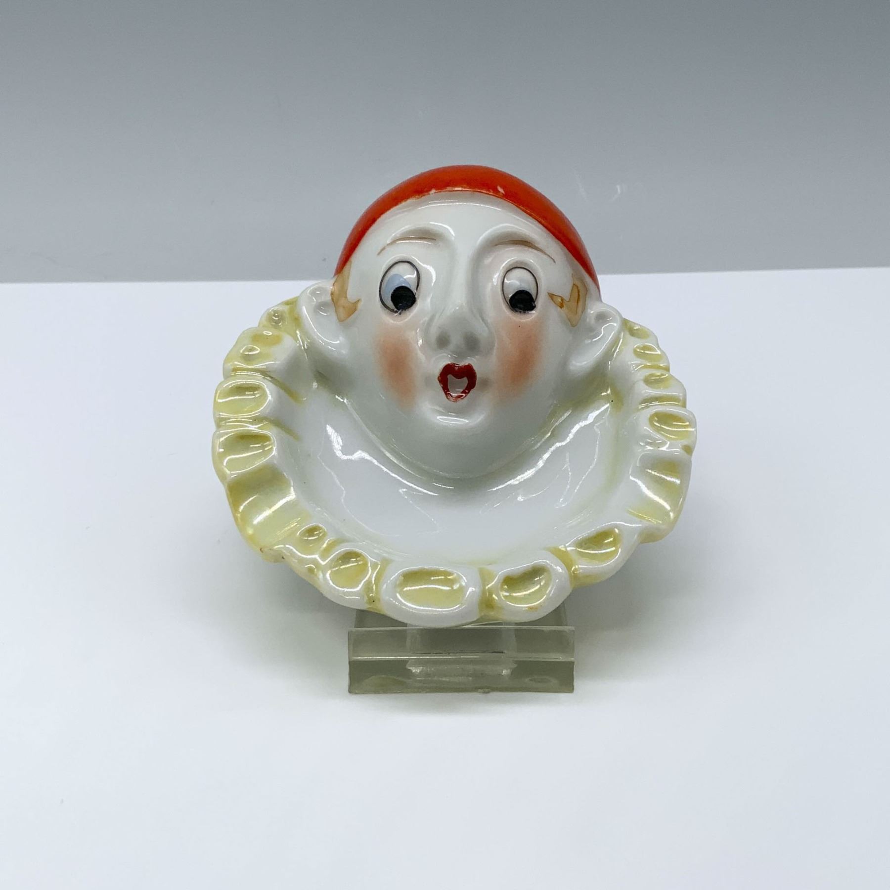 Hand painted porcelain with a glossy finish, featuring a finely detailed mime face adorned with an orange cap and a ruffled green collar, elegantly crafted with holding grooves. Marked made in Japan.