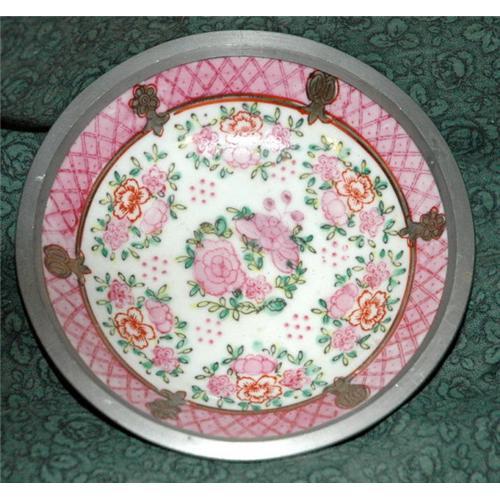 Very pretty Japanese Porcelian Bowl or dish with outter jacket of pewter. It is hand painted in Hong Kong. <p> It measures 5 7/8 across. <p> The condidion is good. There are a few rough spots on the rim of the pewter. <p>