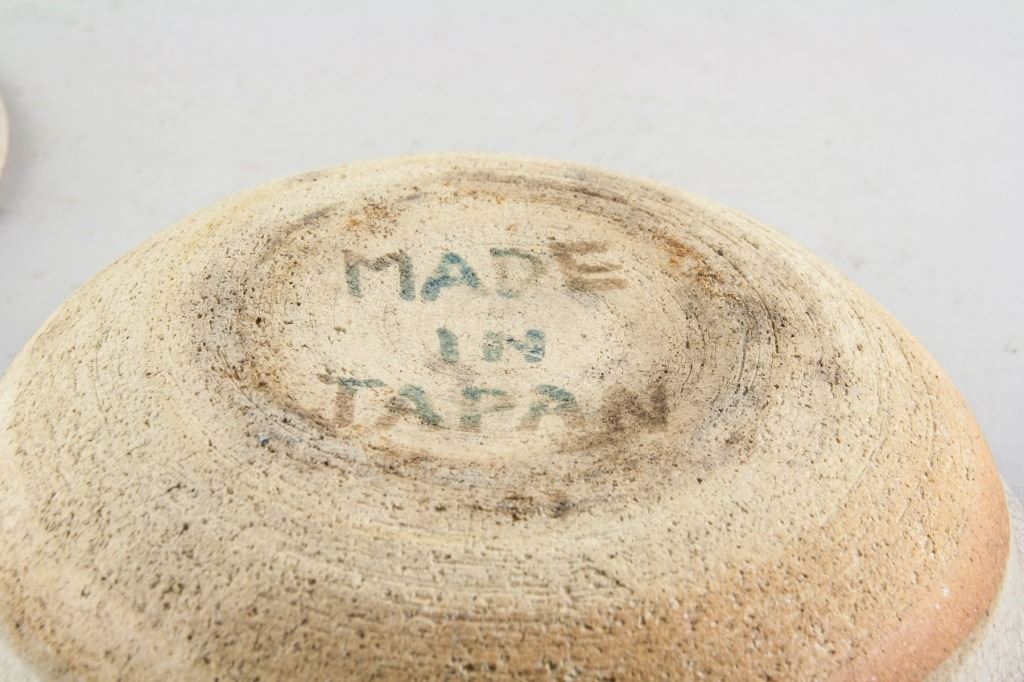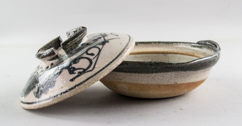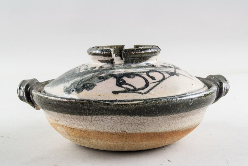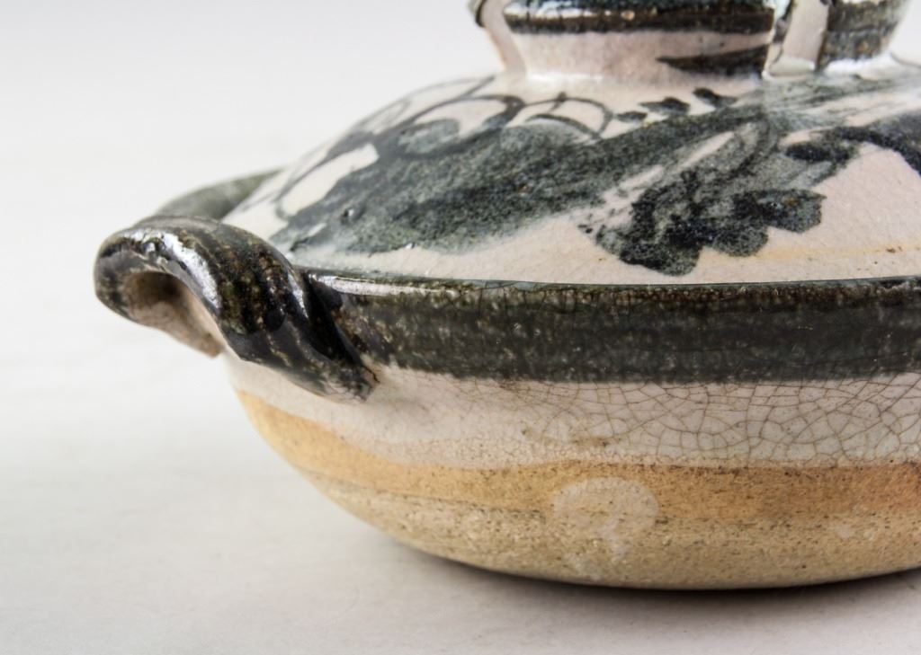 Japanese potter bowl, of rounded edge, tapering to bottom, flanked with tow handles, with lid, painted with flowers, MADE IN JAPAN mark on base, 9 x 20.5 cm, 886 grams