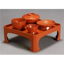 Consisting of ten square trays with raised feet, ten bowls, ten small bowls, five shallow bowls with covers, five rice/soup bowls with covers, five tea cups, five cake dishes and one square box tray. Each bowl with raised ring foot. Encased within an iron mounted wood storage chest inscribed Red Set for Five People and signed Kiou. 61 pieces. Some with minor losses, chips and cracks to lacquer.
