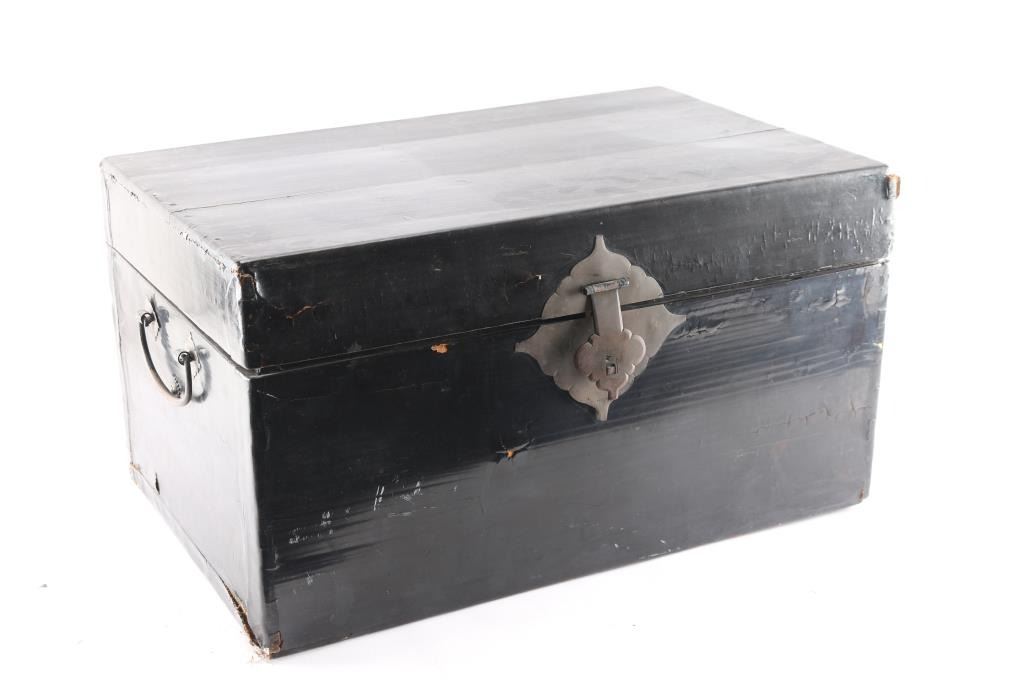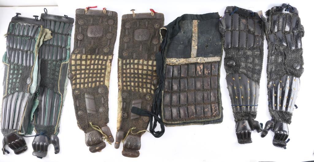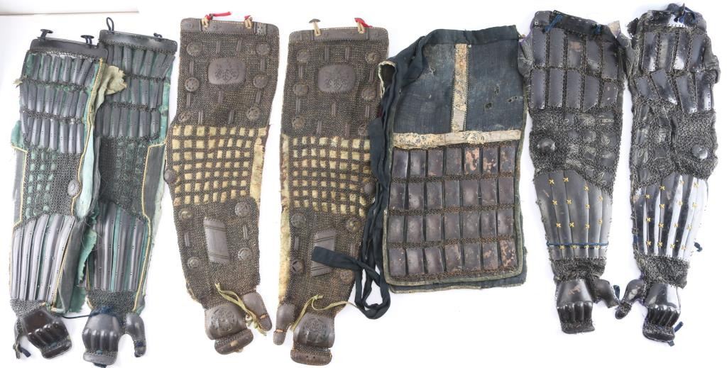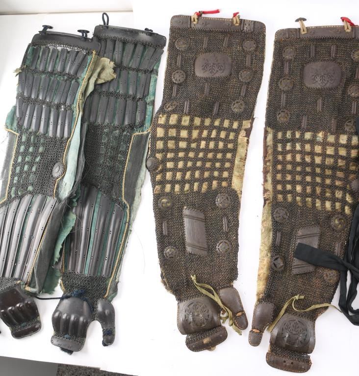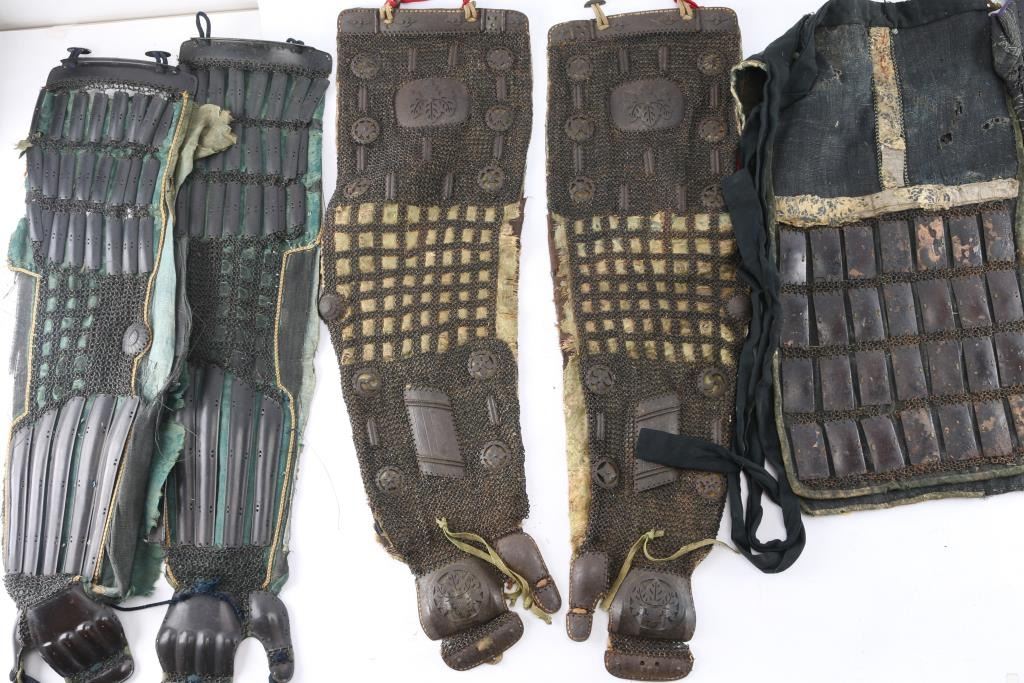 Japanese/samurai black lacquer armor chest. Measures 24 1/2"-L, 15 3/4"-W and 13 3/4"-H. brown lacquered interior with paper tag inside thl with Japanese writing in red. Contains a pair of Haidate (Thigh Guards) Edo period. Floral design white borders, black woven material. lacquered metal plates held in place by chain mail stitched to the material. Intact with some damage to the material. A pair of Japanese Samurai Armor Edo period Kote Iron Arm/hand Guards consisting of 24 small lacquered vertical metal plates attached to chain mail sewn to black mesh green silk material, five long plates on the forearm and metal handguards. Overall good/intact with Deterioration to the silk. A pair of Edo period similar to the above attached to black material with white toned floral designs. Missing the left handguard, and a pair of chain mail Kote with Paulownia (kiri) leaf crests on upper sleeves and handguards, also known as the Kiri-mon Crest, holds deep significance in Japanese culture, particularly for samurai families and those associated with leadership, nobility and high status. Historically, the Paulownia Seal was initially the private symbol of the Japanese Imperial Family, it was viewed as the second noblest crest after the Chrysanthemum Seal, Emperors granted the Paulownia Crest to samurai and other powerful individuals as a mark of honor and distinction, symbolizing their loyalty and noble lineage. Also Samurai clans adopted the paulownia crest as part of their family emblems (kamon). The paulownia crest is particularly associated with Toyotomi Hideyoshi, one of Japan's most prominent unifiers, who adopted it as his family crest. Kote also has 10 metal symbols including the Hoshi (Star), three Tomoe, etc. Hinged top plate, green silk backing with floral designs. Overall very good condition.