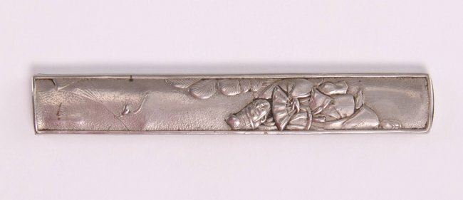 Japanese Samurai Kozuka decorated with an elder holding a hand fan. A Kogatana is a small utility knife that fits into a pocket on the saya, the kozuka is the decorative handle for the Kogatana, 19th Century. (Size: See second photo for measurement.) Photos are part of the description representing the condition report. Pangaea Auctions urges Bidder's to view all attached photos.