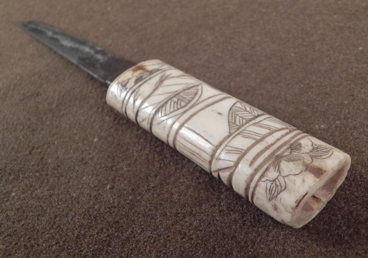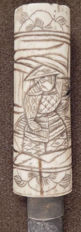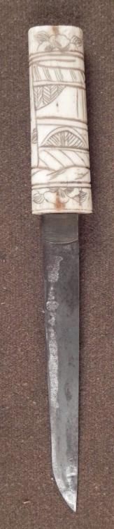 This old Japanese Samurai style dagger has a whale bone handle carved with decorations and a figure on front. The detail is very good on the designs. There are a nicks on the grip's end, and wear on the blade. Overall it is in very good condition. The * blade length is 6 inches, and the overall length is 10 1/2 inches. There is no scabbard. * * This is is a fine carved piece for any collector of Japanese carved bone or blades.
