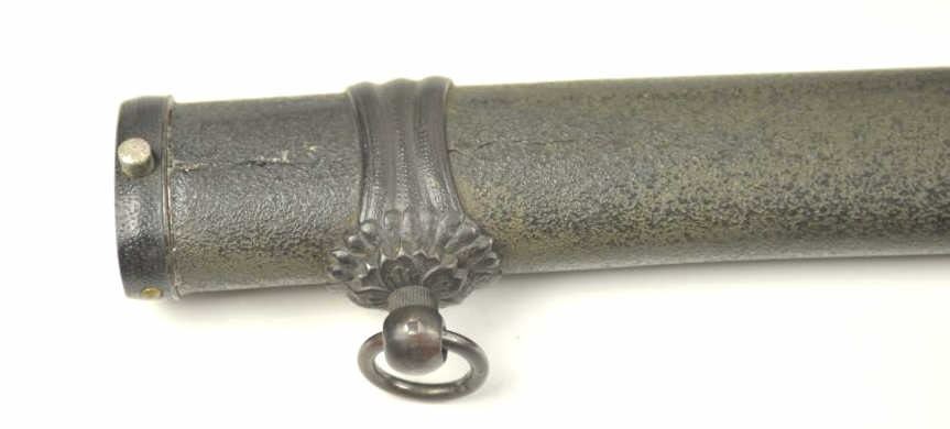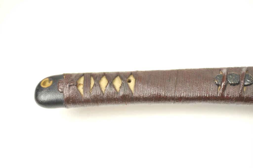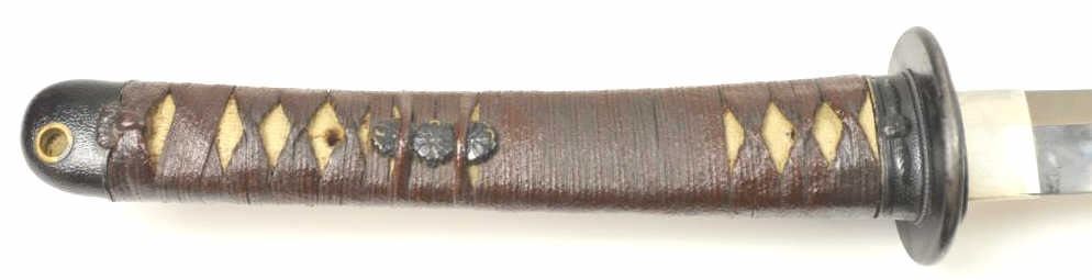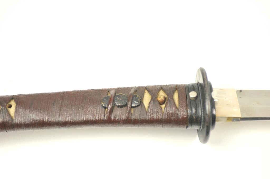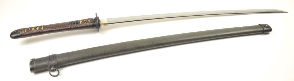 Japanese Samurai Style Sword with handmade signed and dated blade in high grade WWII era mounting. The katana size blade measures 25 ¾” and in near fine state of polish with temper visible to tip and only minorscratches and ages. Two holes in tang with signature. Textured lacquer over wood scabbard to look like metal with brown wrapped long military style grips and plain military style mounts. A very interesting and unusual mounting that is purposely understated to appear like a common issued sword. Est.: $600-$1200