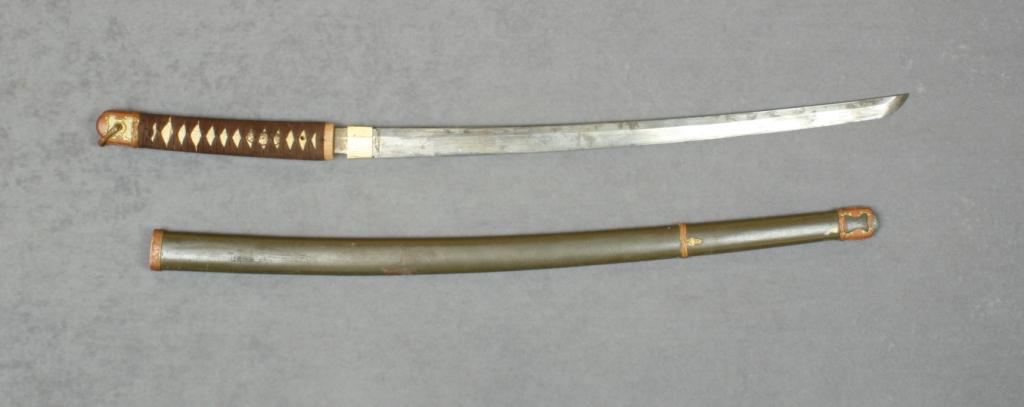 Japanese Samurai sword and military metal  scabbard, blade is signed on the tang and  shows scattered surface dirt from years of  storage; no Tsuba and loss of several other  minor grip mounts, ray skin wrap with twoMenuki and brown cord wrap; pommel cover  present; scabbard shows considerable olive  green paint; signature characters should be  researched.  Est.:  $400-$800.