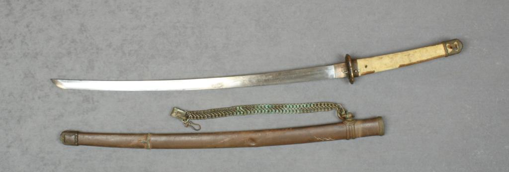 Japanese Samurai sword and military metal scabbard, blade signed on tang, Tsuba present as is the pommel cap however, menuki and cord wrap is missing; ray skin is still present on grip; blade shows nicks to theblade and some spots of discoloration; scabbard is uncleaned and shows a bullet hit in the middle quadrant with scabbard mounting remaining; accompanied by a chain sword hanger. Would be interesting to research the character signature on the sword’s tang. Est.: $400-$800.