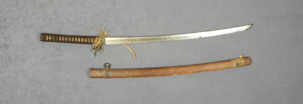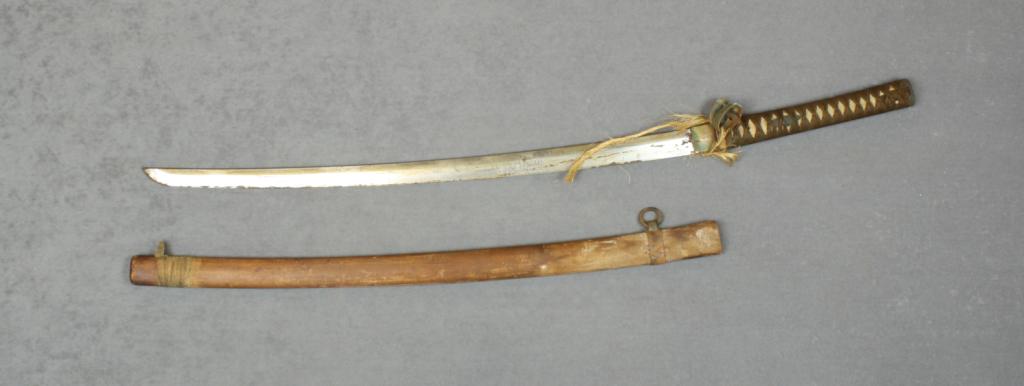 Japanese Samurai sword and wood scabbard in  bring back, untouched condition blade is not  signed and shows scattered surface rust and  crud from years of storage, missing Tusba,  ray wrap intact as well as cord wrapping andtwo menuki ; several additional mountings  attached; a project for restoration.  Est.:   $400-$800.