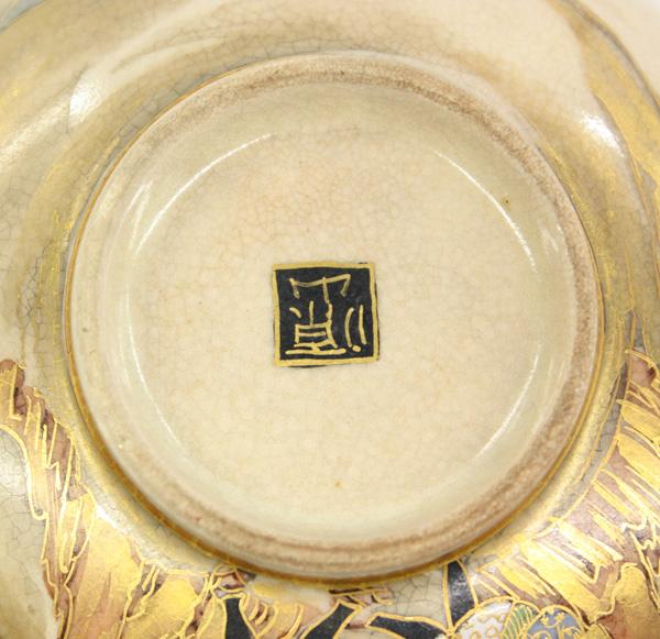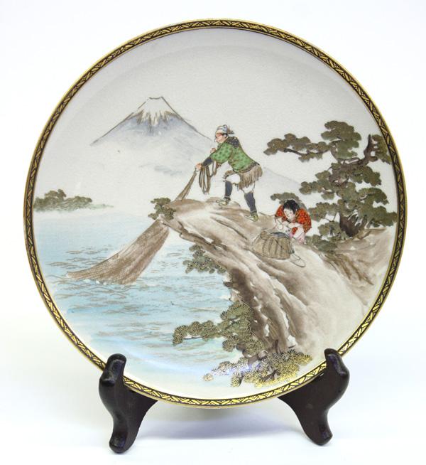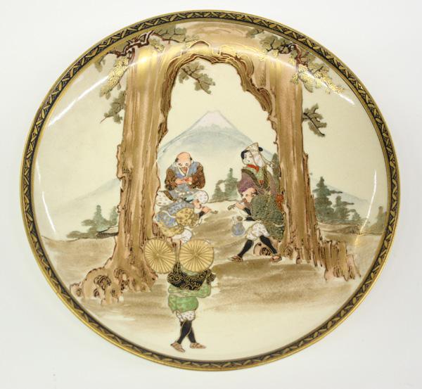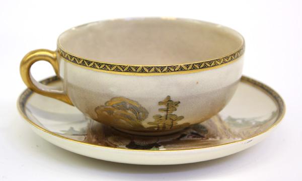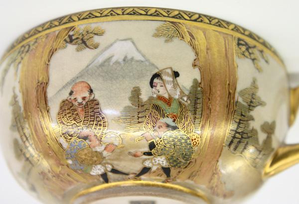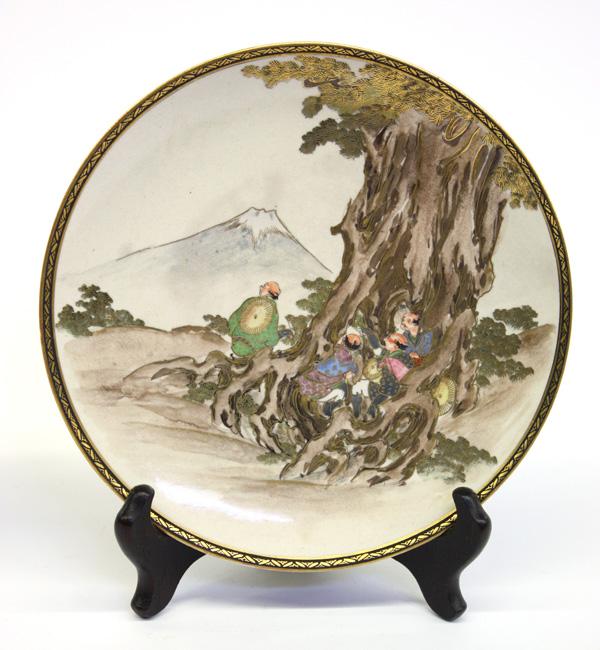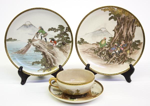 (lot of 4) Japanese Satsuma style earthenware dishes, 20th century, each signed Genzan and featuring a view from one of Hokusai's prints from the series Thirty-six Views of Mount Fuji, consisting of a cup and saucer, together with two plates, plate 7.375''d