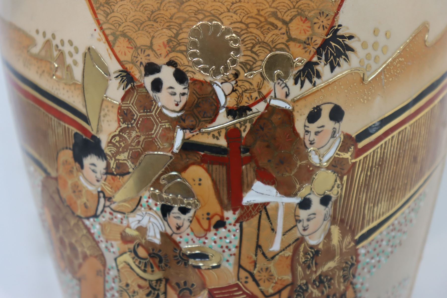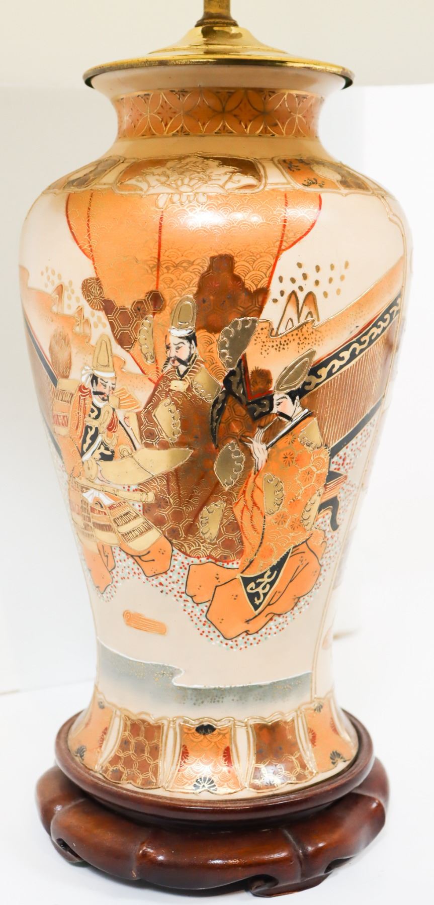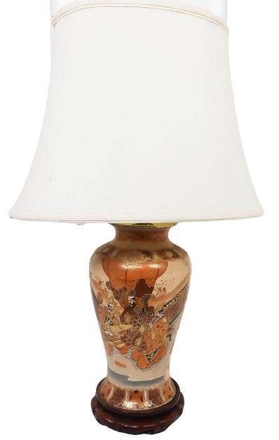 Japanese satsuma vase mounted as a table lamp. Adult and children figures. Size: 28 x 11 in.