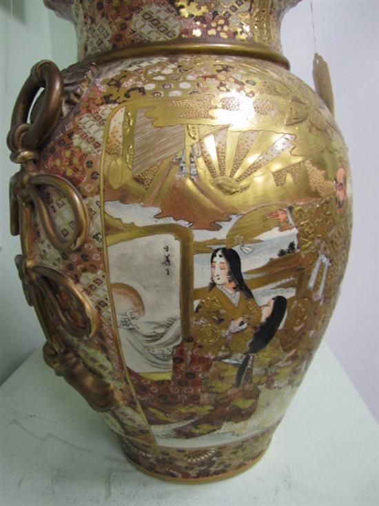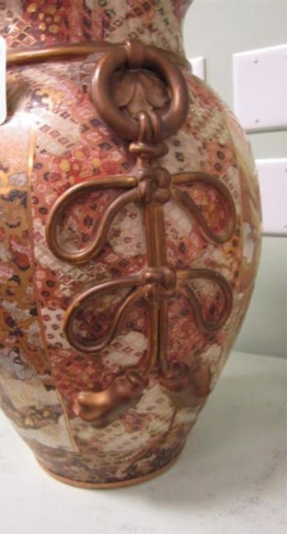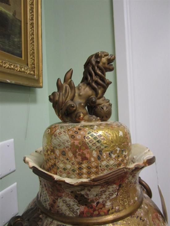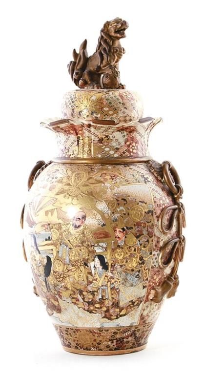 Japanese Satsuma earthenware covered urn early 20th century, Foo lion finial on domed-cover supported by ovoid urn decorated with soldier and war scenes, flanked by applied ring-and-ribbon handles. H27in