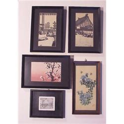 VARIOUS, three woodblock prints, a watercolor and an etching, largest frame 12 x 6", all framed with glass. (5) STARTING BID $20. ESTIMATE $20 TO $1000