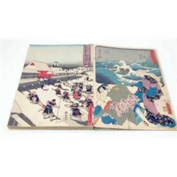 Japanese School album of woodblock prints, Tritychs depicting figures and landscapes, 22 double sided pages, 14 x 9.5 ins. £350-500